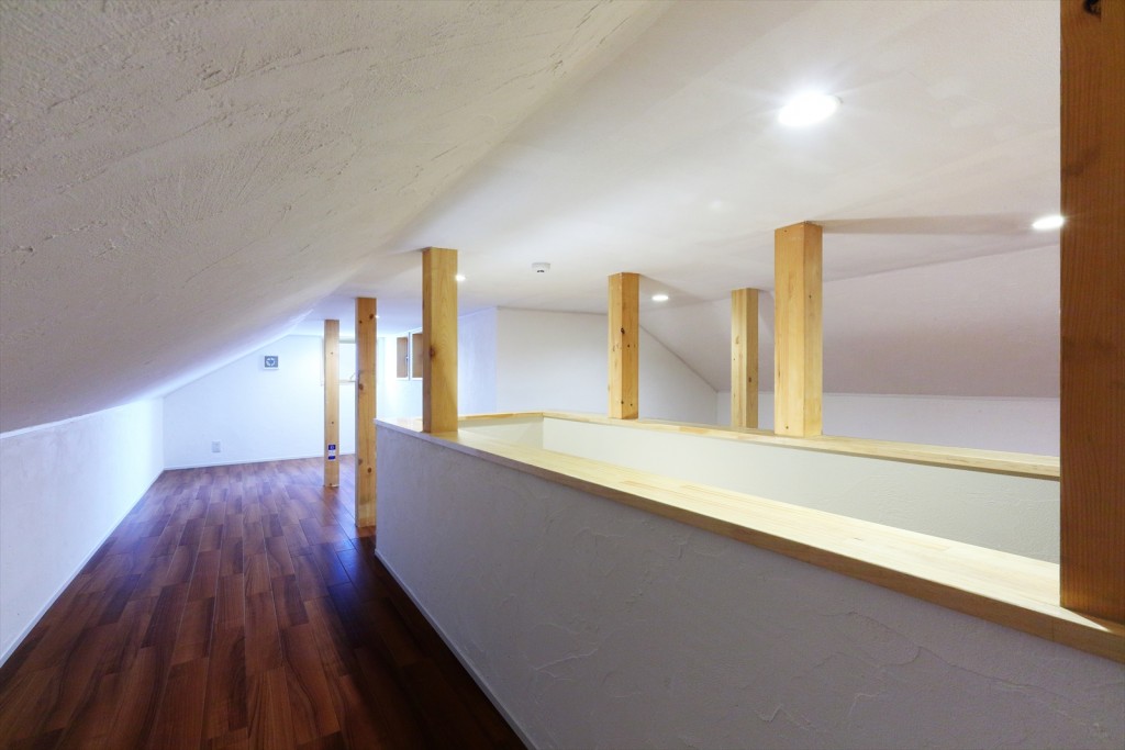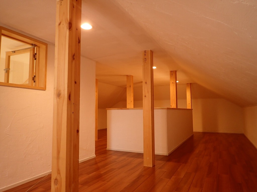小屋裏のスペースを有効活用して、大空間の小屋裏収納を実現。内装はスイスしっくいを塗って仕上げています。空気の循環を考慮して小窓も設置しました。