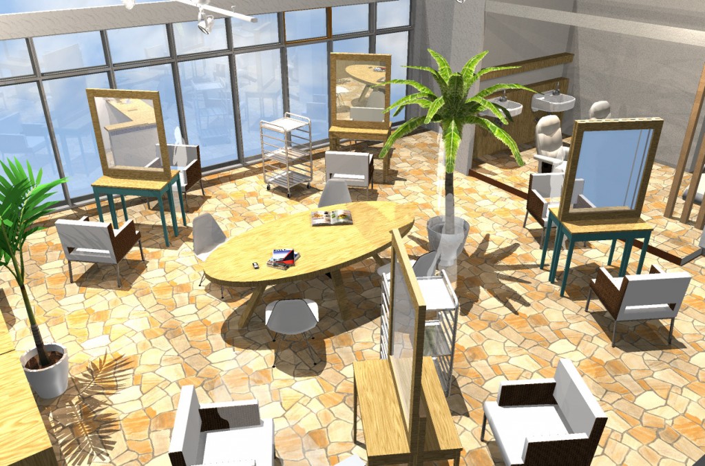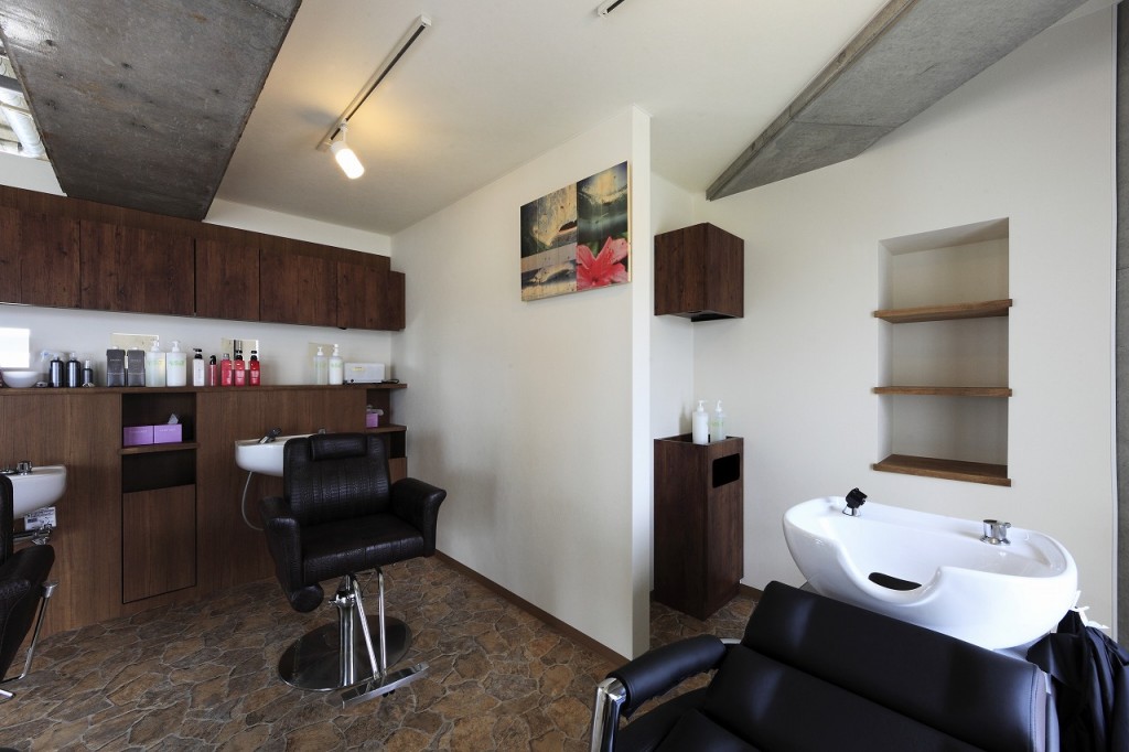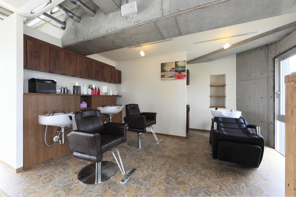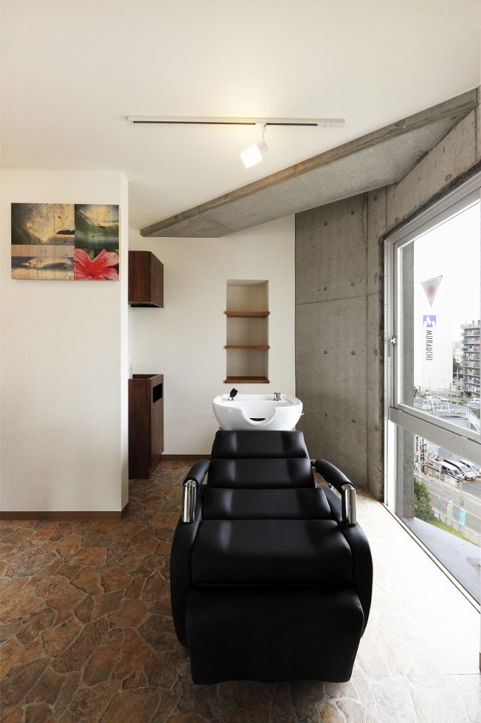 両面ガラスに囲まれた開放的なフロアで、全体に光が満ち溢れ明るく広々とした空間です。内装は、「西海岸のリゾート」をテーマにコーディネート。穏やかな波の音が聞こえてきそうなリラックスできる美容院に仕上がりました。