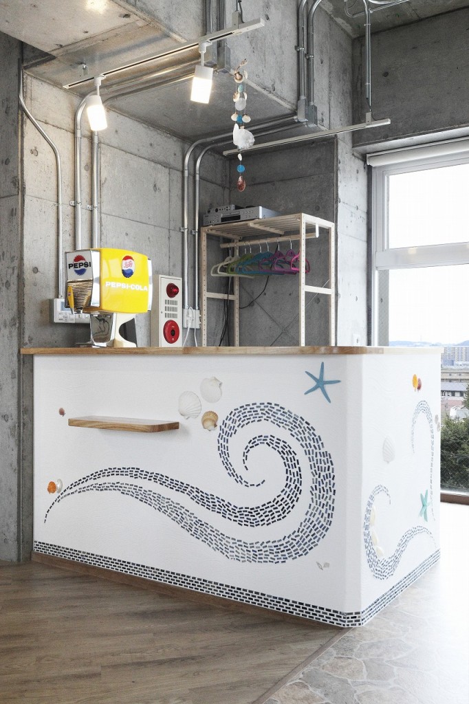 受付カウンターの仕上げにはスイス漆喰を使用し、テーマである「西海岸の海」の貝殻やヒトデなどを使ってアートに表現。さざ波の模様は施主ご本人様が青いモザイクタイルを貼ってつくりました。
