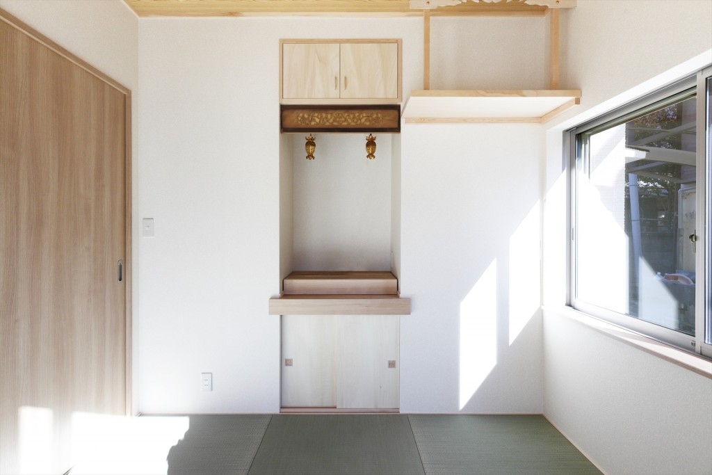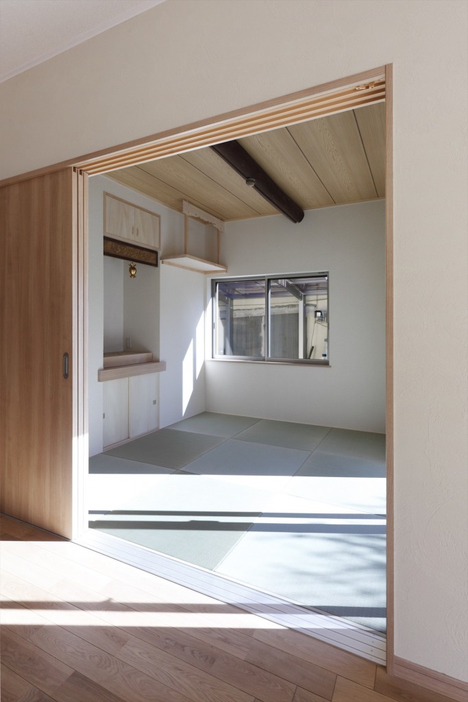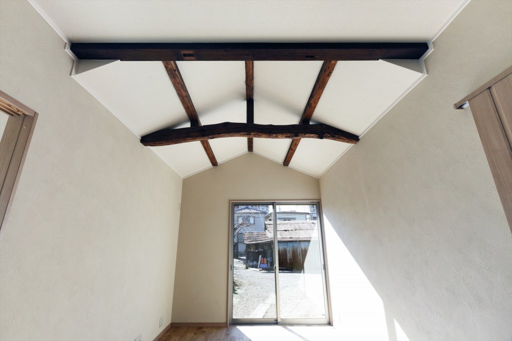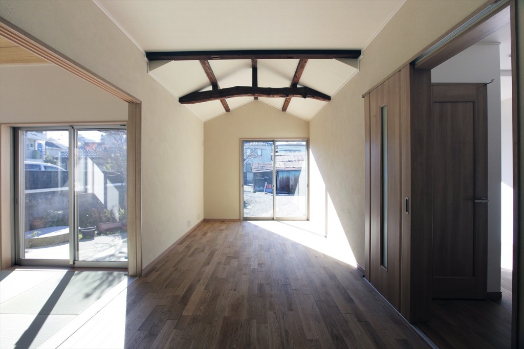 ダイニングと繋がる和室(4帖半)天井には古材の梁を化粧梁として再利用。