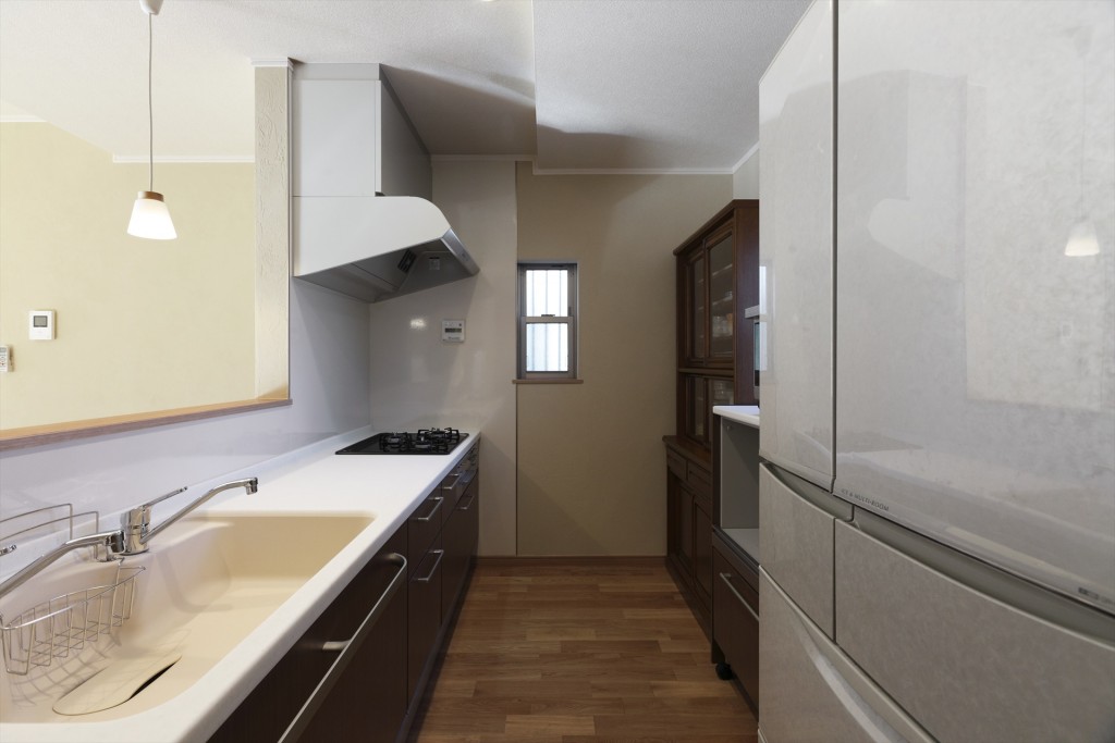 十分な幅と奥行きのあるキッチン。大きな冷蔵庫・家電収納庫・食器棚も余裕で置けるスペースを確保。
