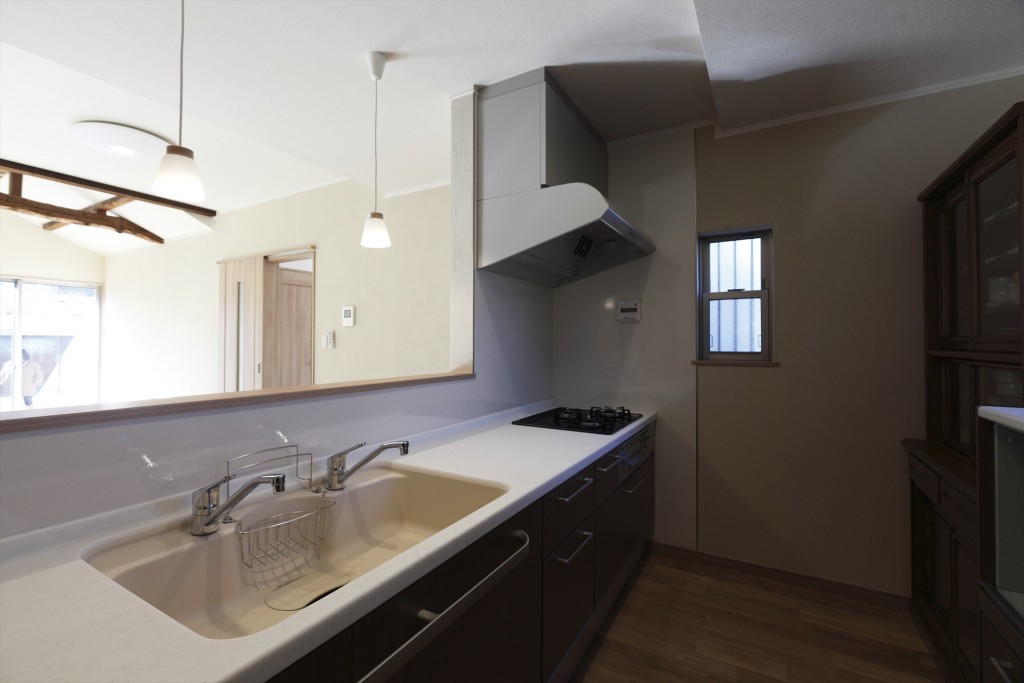 広い敷地内にある築55年以上の木造平屋(約30坪)のお住まいは、過去に増築などを行なった部分の痛みが激しく、補修しないとどうにもならない状態だったため、耐震補強も含むスケルトンリフォームをご提案。梁を露出させ、もともと床の間にあった格子を再利用するなど長年住んできたお家のよい部分を生かしながら、新築のようにリニューアルしました。