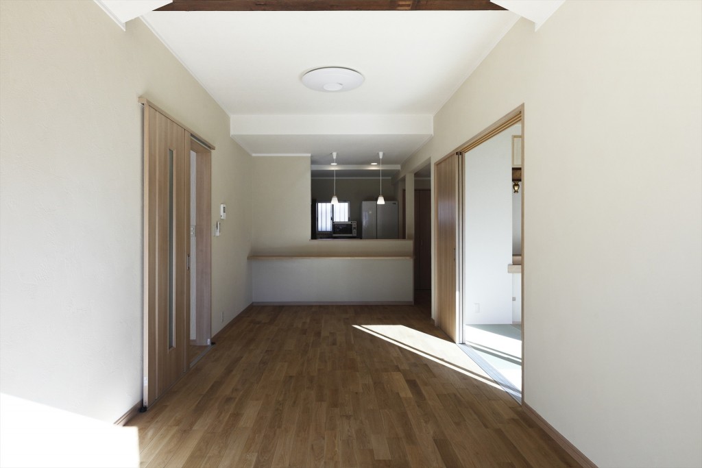 キッチンから南側のリビングを見渡した様子(左側は和室)