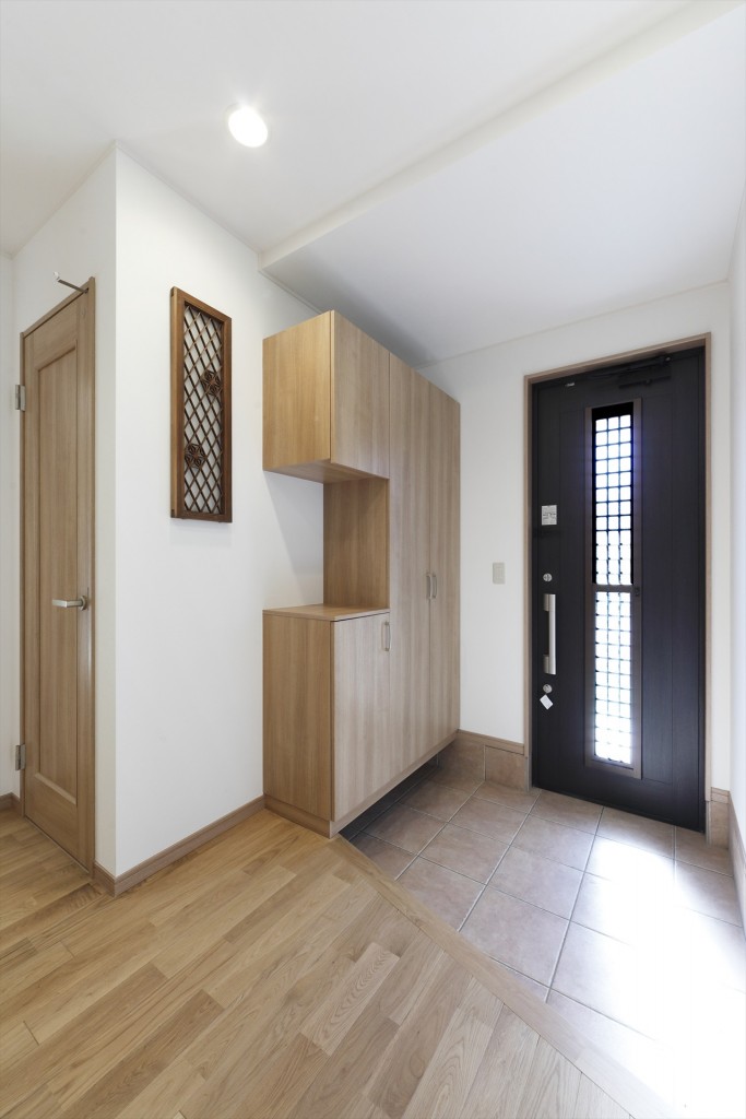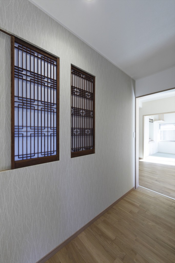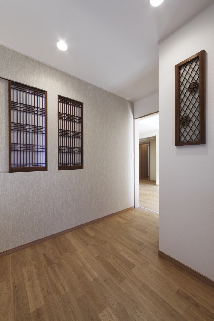 玄関ホールの壁には和室の建具を装飾として再利用。