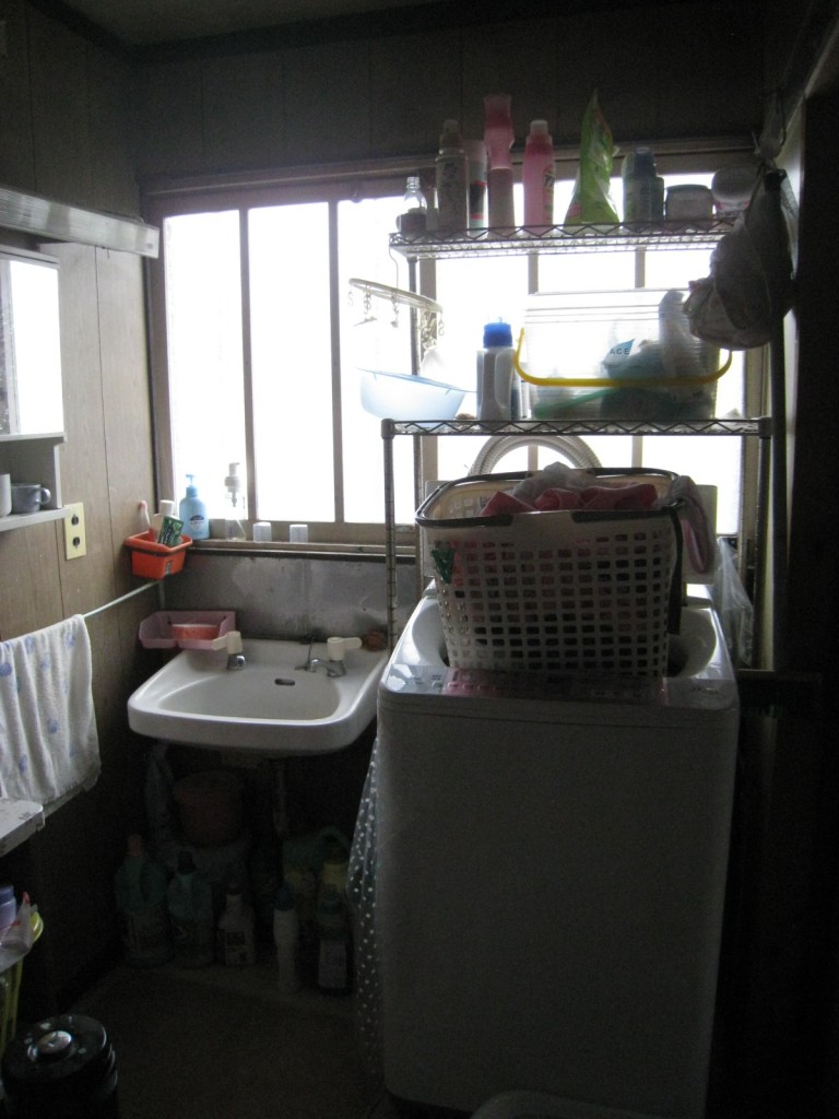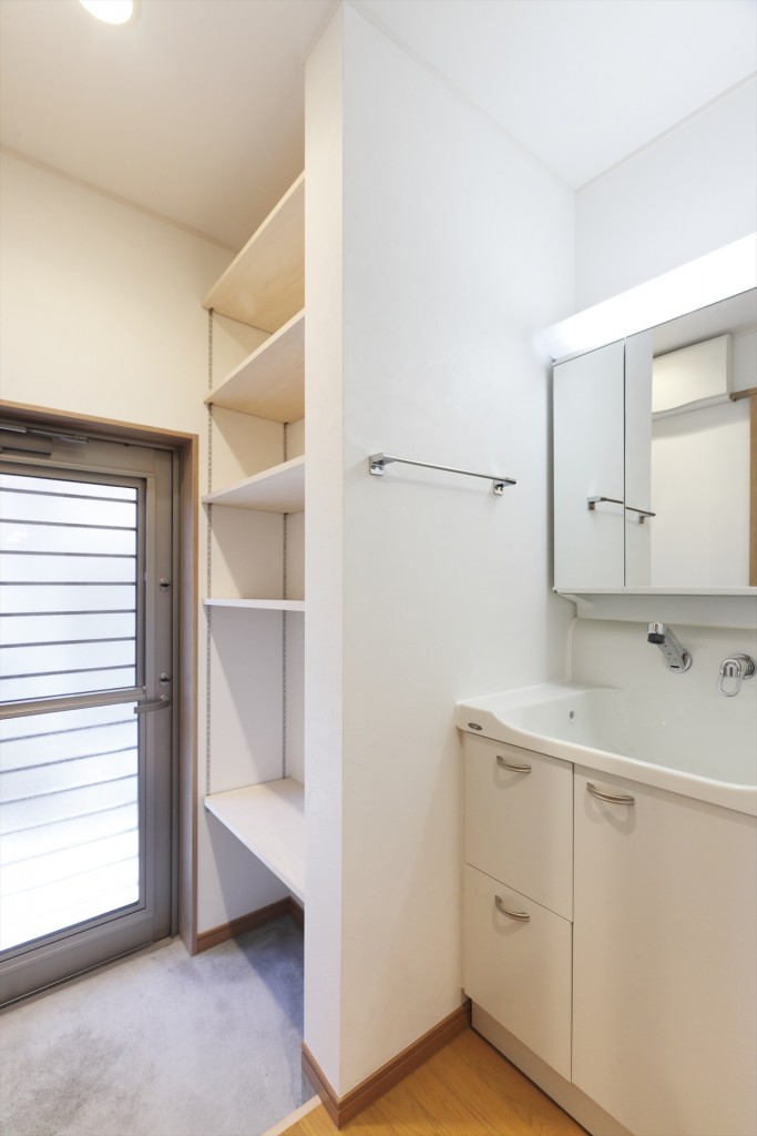 化粧洗面台:トクラス EJ 横にはたくさんストックできる収納棚を設置。