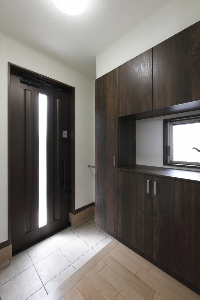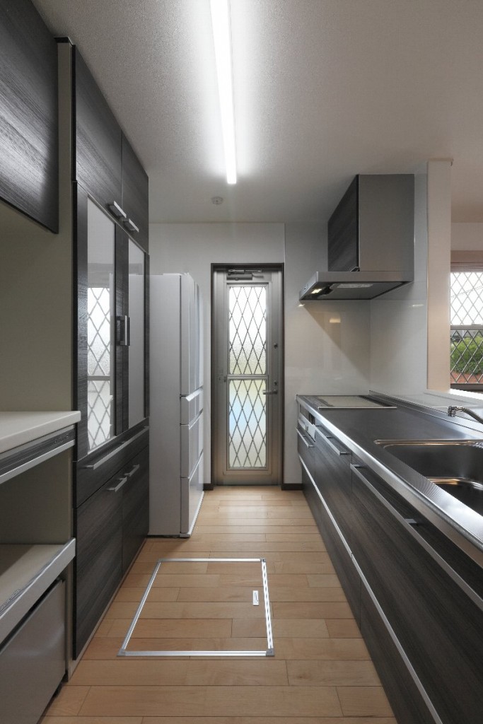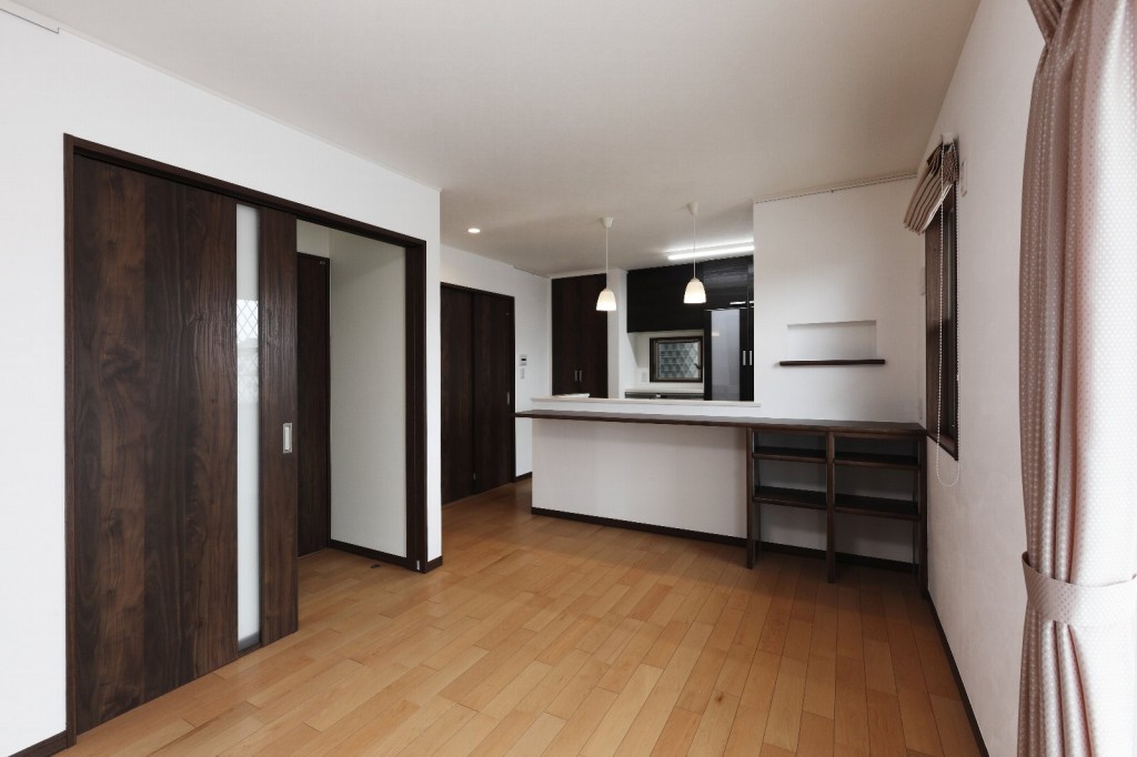 LDKは建具の色と床の色を対比させたことで引き締まったシャープな印象に仕上がりました。