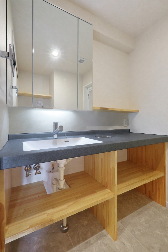洗面台はこだわり造作。幅150㎝のゆとりのあるおしゃれな空間です。カウンター下には収納スペースをたっぷりと確保。カウンターはアイカ工業、鏡はミラタップを採用。