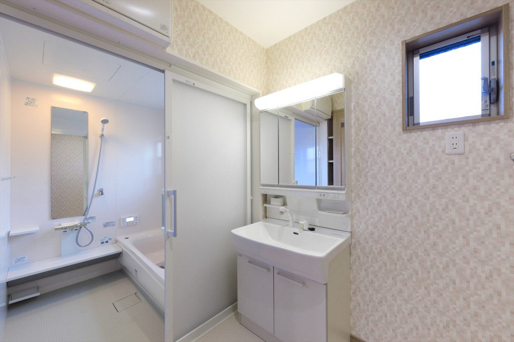 清潔感あふれるサニタリー空間。壁はモザイクタイル調のクロスでおしゃれな空間を演出しました。