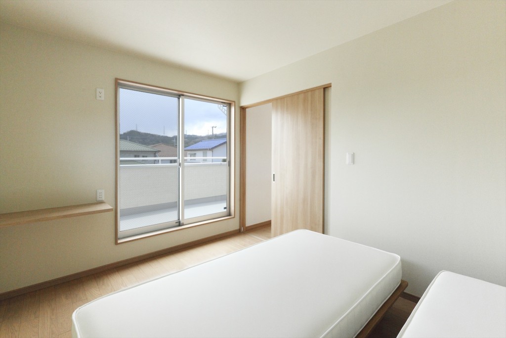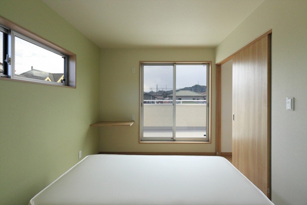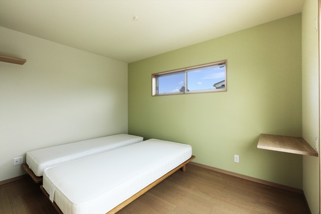 グリーンを基調としたご夫婦の寝室。やさしい印象のアクセントクロスを採用して落ち着く空間になりました。