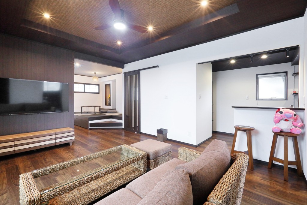 1階は主に日常の生活スペースとなるため、今のお住まいで気になるところ・不便なところをヒアリングし、それらを解消できるような間取りの提案・施工を行い、2階については1階と異なり、アジアンリゾートや和モダンの要素を感じられる、暗めで落ち着いたリゾートライクな非日常空間になるようプランしました。1階2階ともに開放感が欲しいというご希望を担当設計士が耐震性などを考慮の上、叶えることができました。またご契約前のお打ち合わせ期間では、新春もちつきに参加してくださり、イベント・社内の雰囲気を楽しんでいただけました。