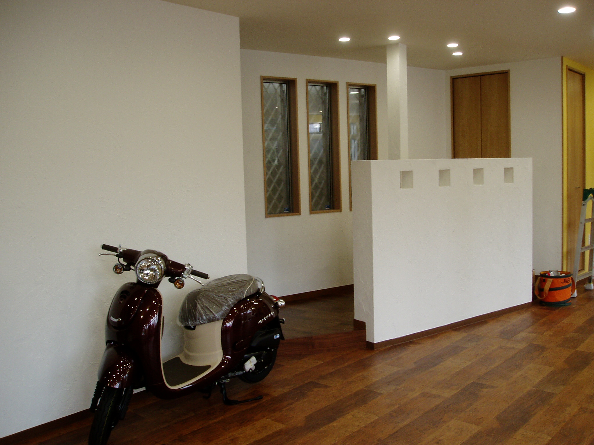 大通りに面した老舗のバイクショップ。東日本大震災後、我が家の耐震性が心配だというご相談をいただきました。店舗・住居共に採光が少なく、間取りも今の生活に合わせた解放感のある空間にしたいとのご希望でした。