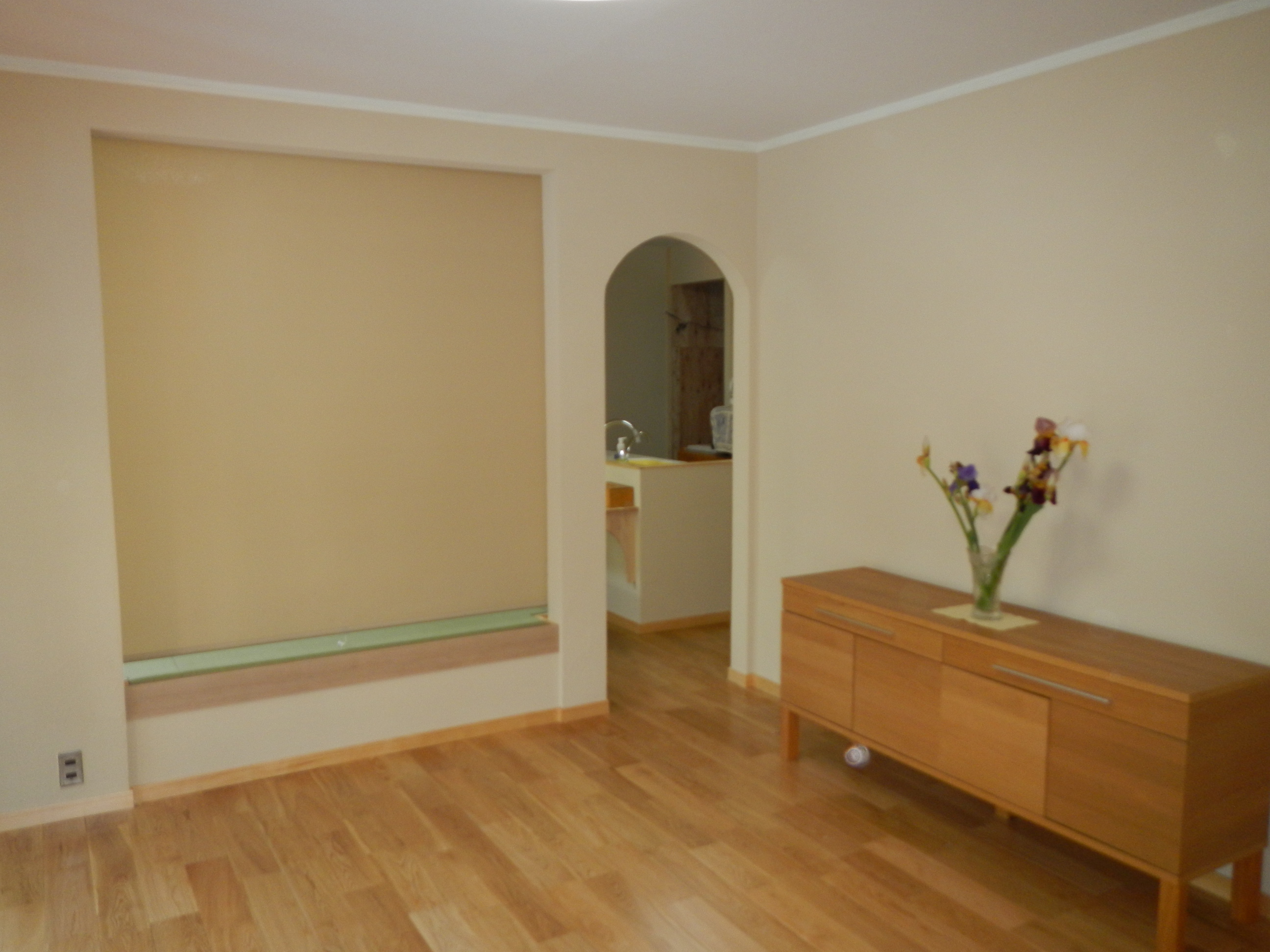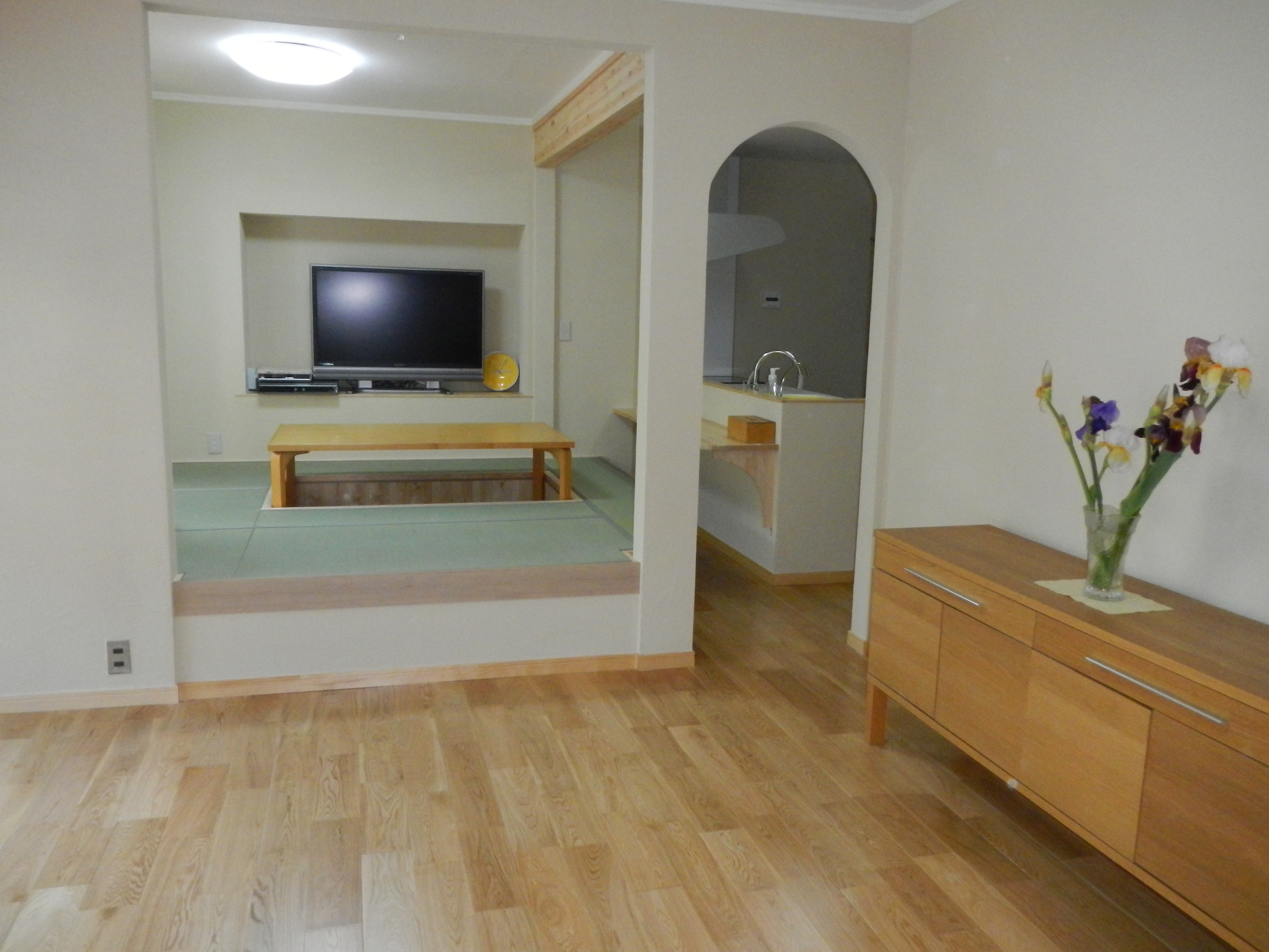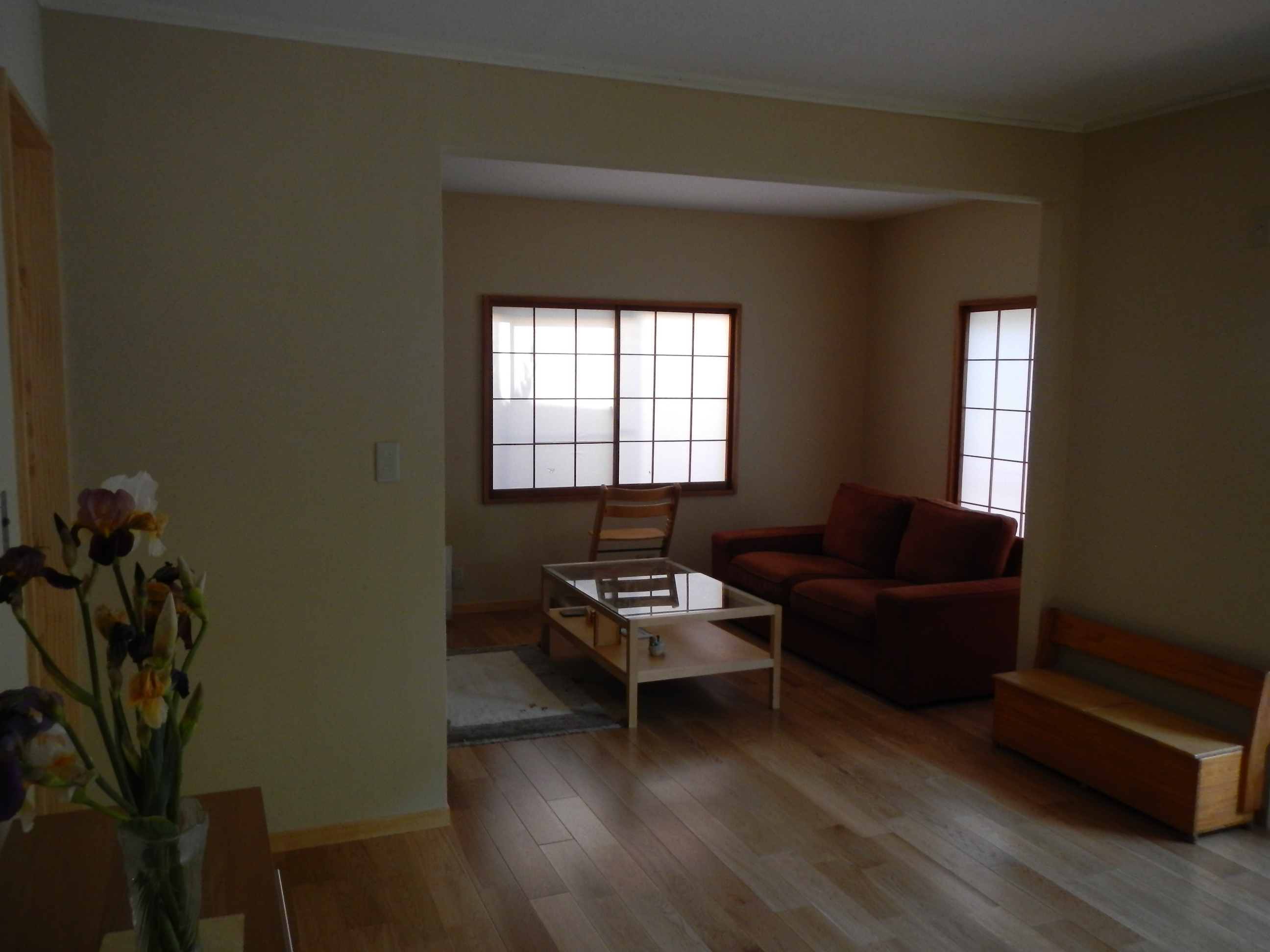 自然素材に包まれた明るいLDK。床は無垢のナラ材、壁は珪藻土です。お持ちだった家具との相性も抜群です。