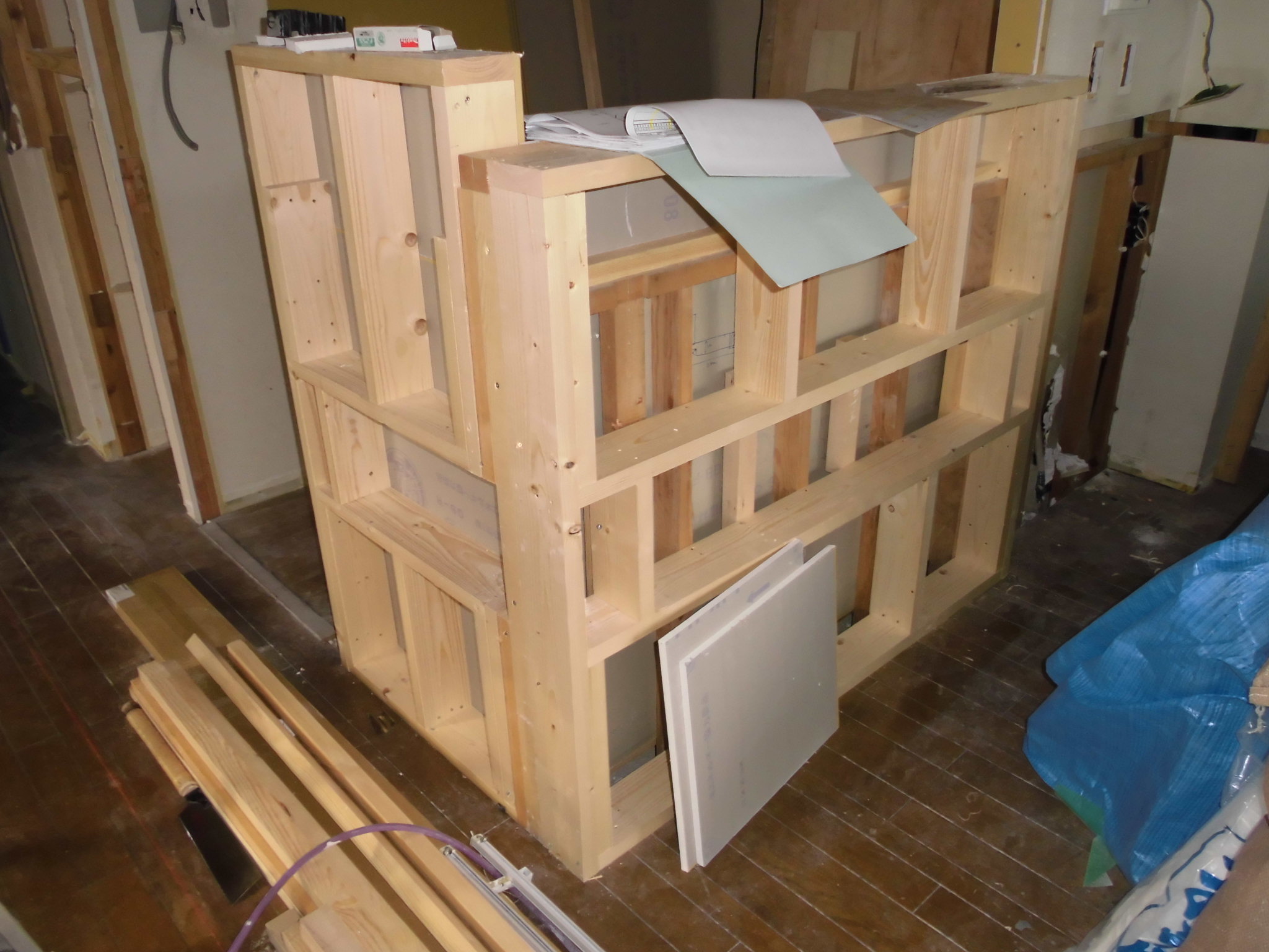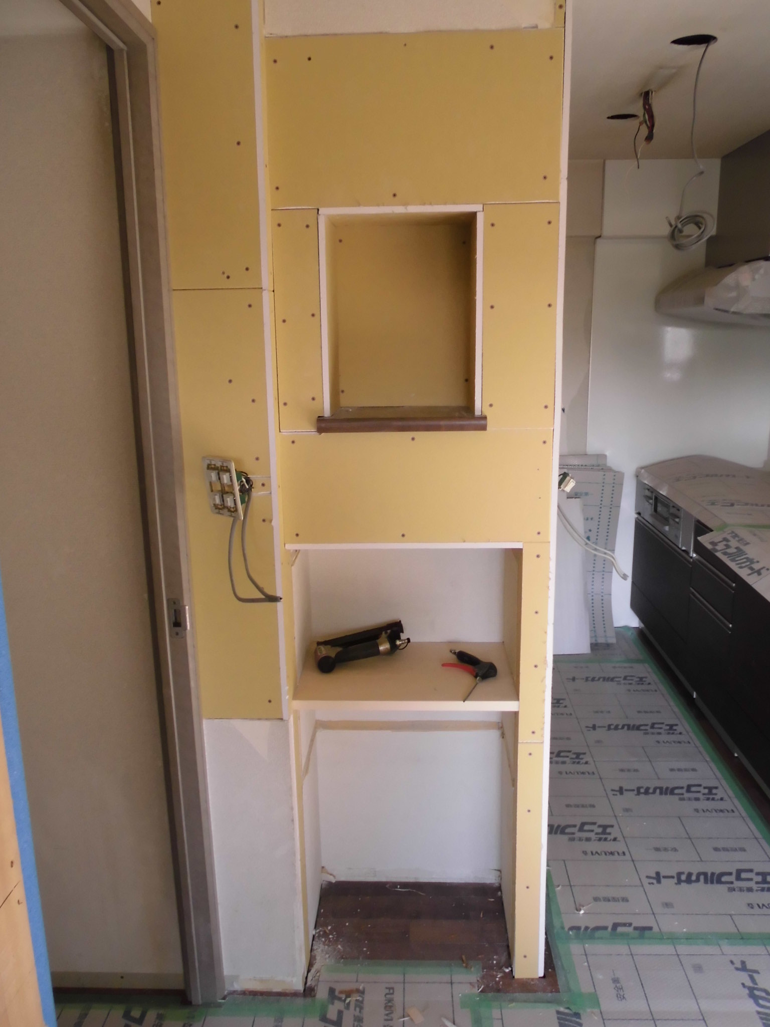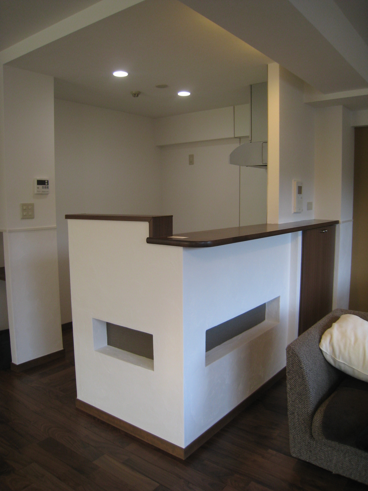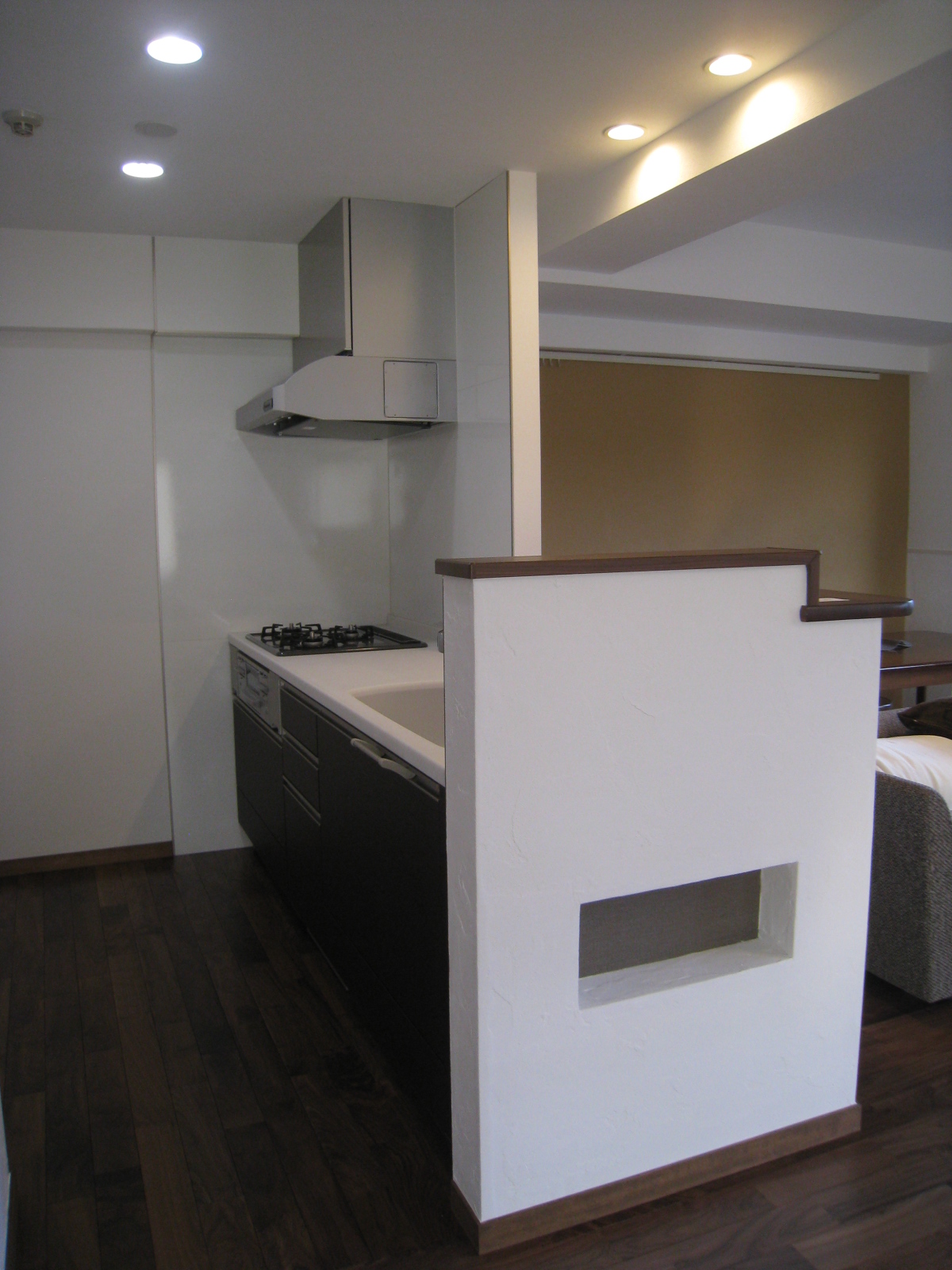 閉鎖的なキッチンから吊戸棚や袖壁をなくして広々見渡せる開放的なキッチンへ。キッチンの壁にはディスプレイ用のニッチを造作しました。