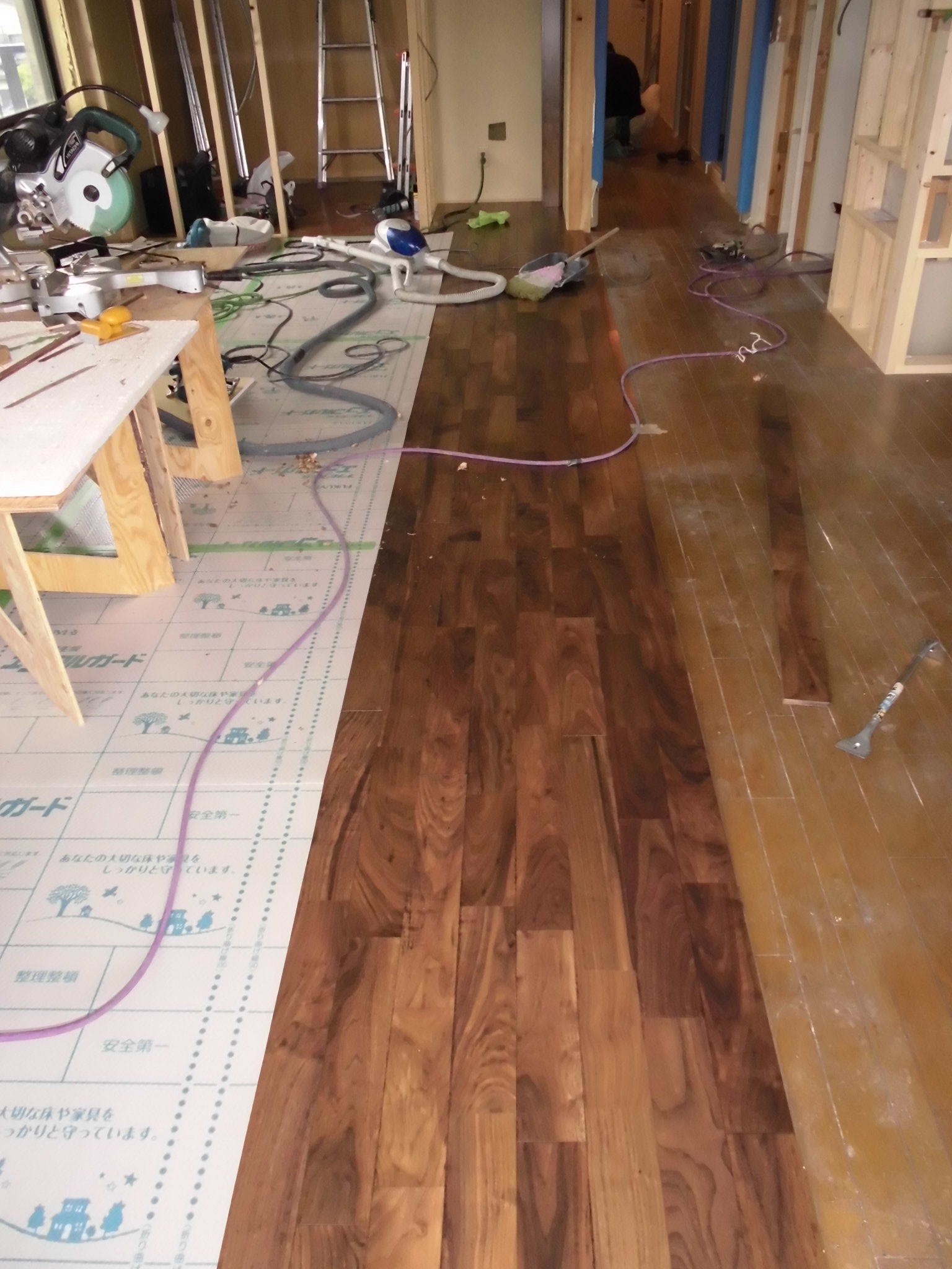 高級感溢れる雰囲気にオープンなキッチン。まるでモデルルームのような空間に生まれ変わりました。床は重厚感ある無垢のウォールナットを上貼りし、壁の一部はスイス漆喰で仕上げました。