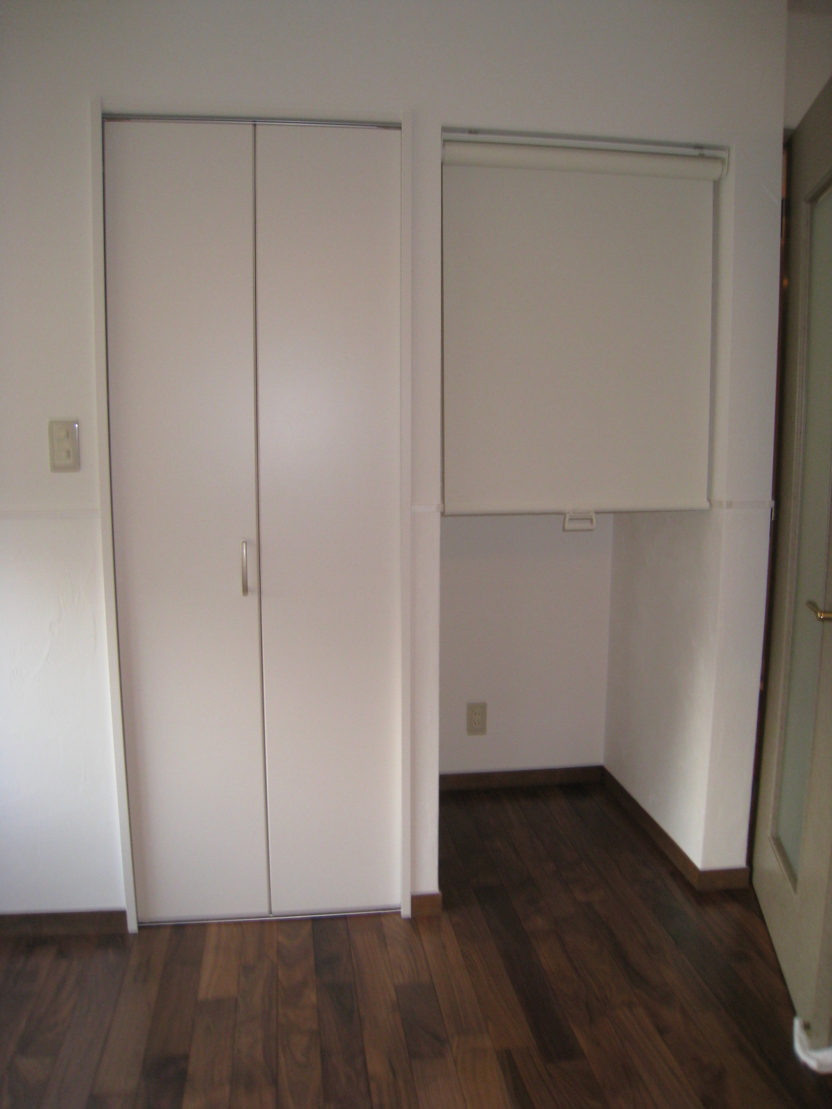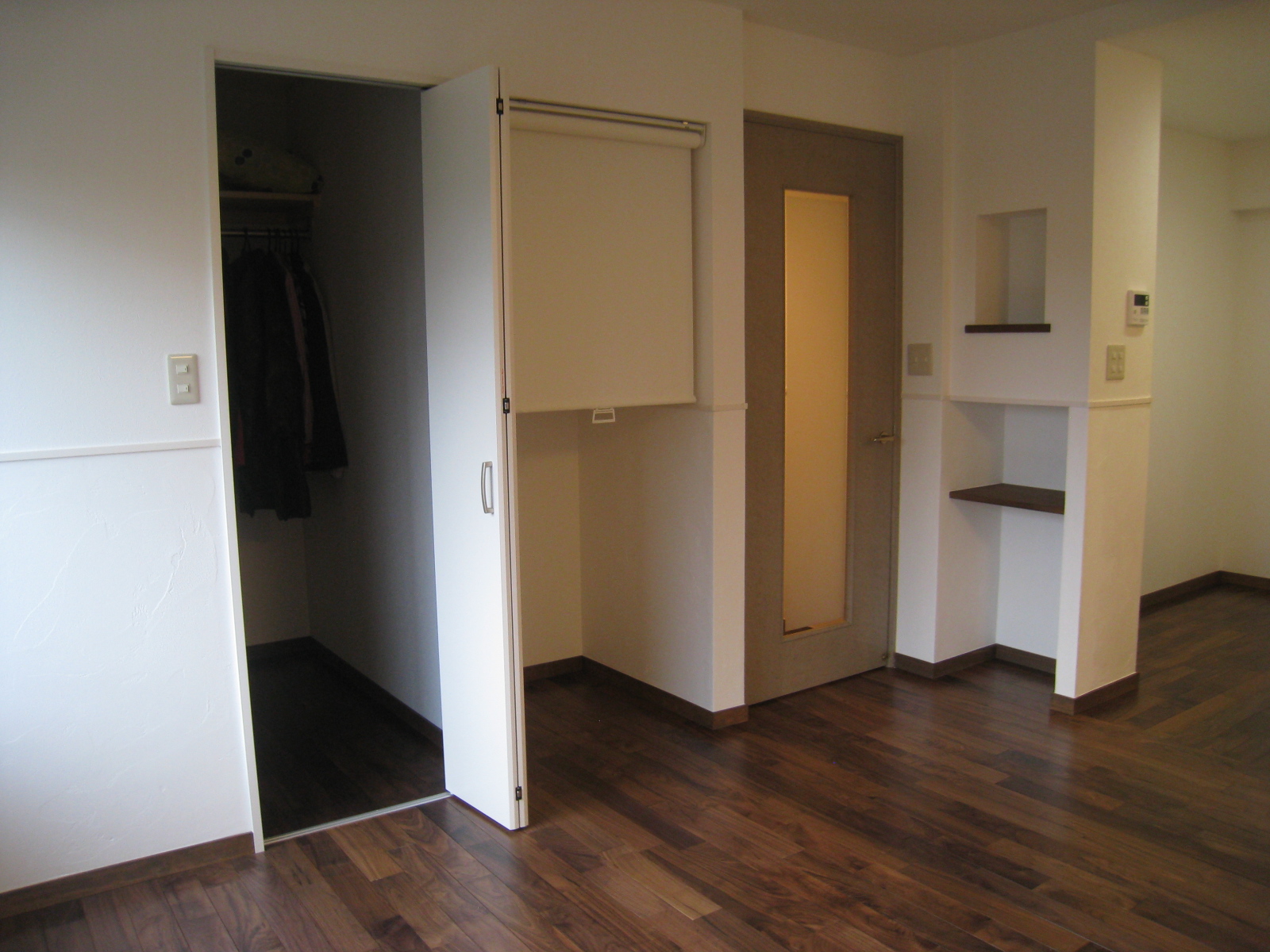 リビングの収納。左はウォークインクローゼット、右は仏壇を置くスペースです。ロールスクリーンで目隠しできるように工夫しました。