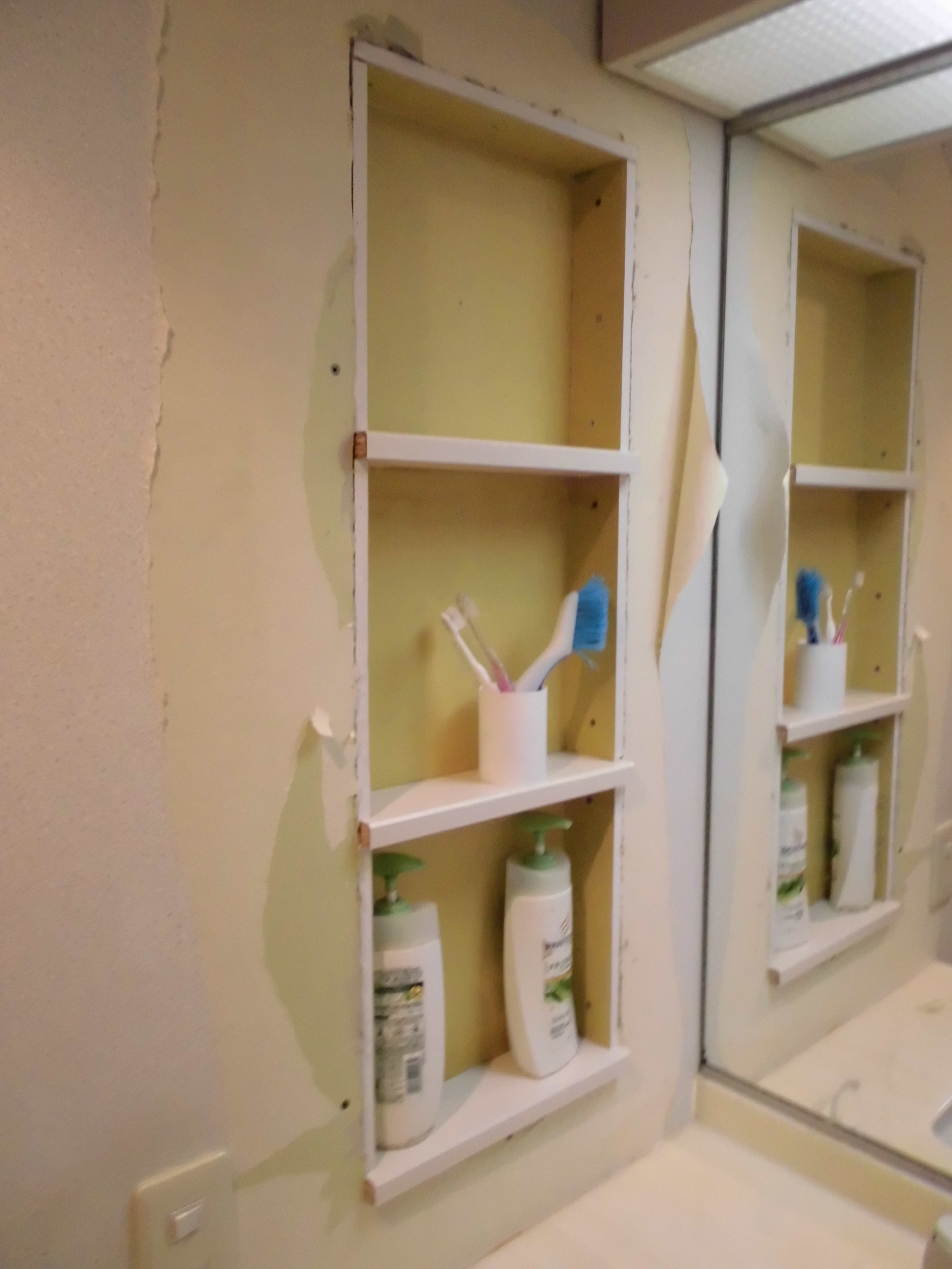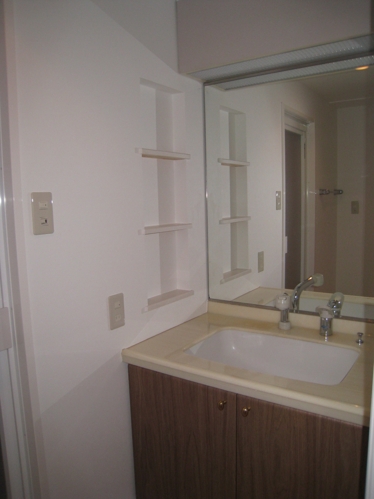 洗面台は既存利用しました。ウォールナット調のシートを扉の面材に上貼りして雰囲気をガラリと変えました。