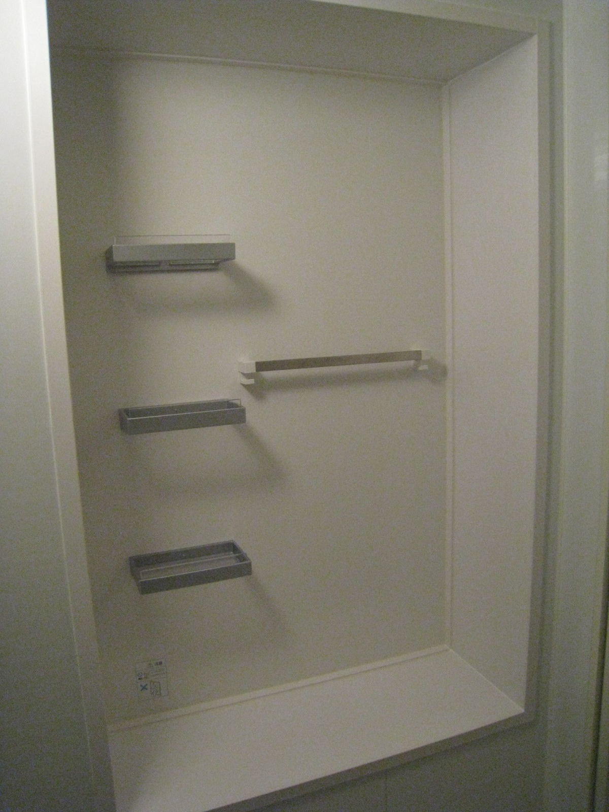 洗い場側の無駄な奥行スペースはタオル掛けや収納棚を取り付けて有効活用