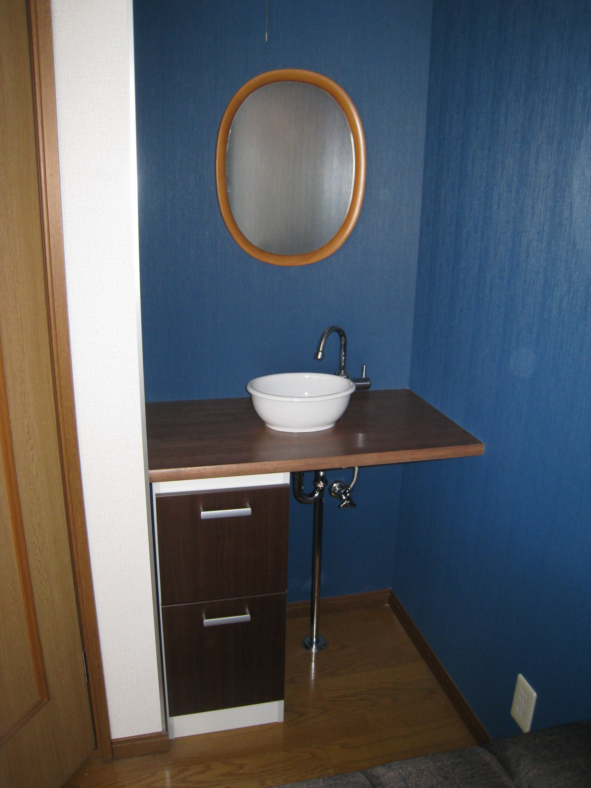 H様のお住まいがもっと快適になるように使い勝手の良い最新の水廻り設備をご提案させていただきました。ブルーを斬新に取り入れた造作洗面スペースは私のお気に入りです。