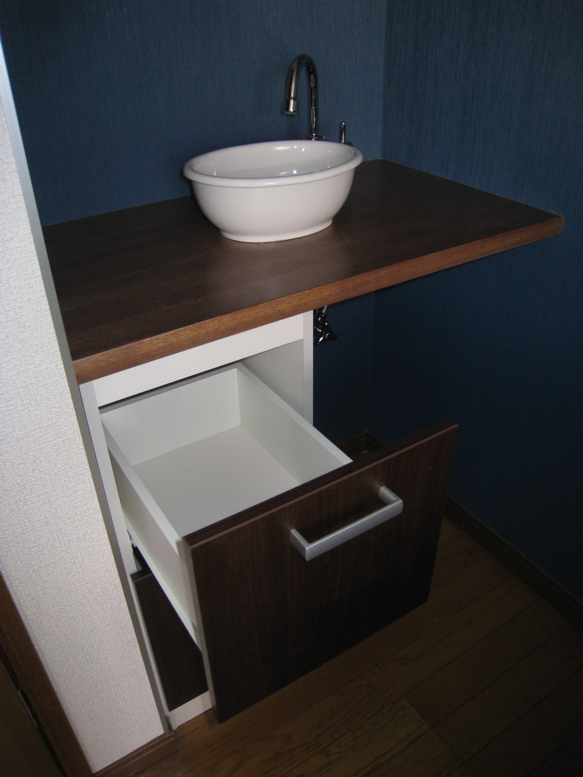 お好きなブルーをアクセントに取り入れたオリジナルの造作洗面台。