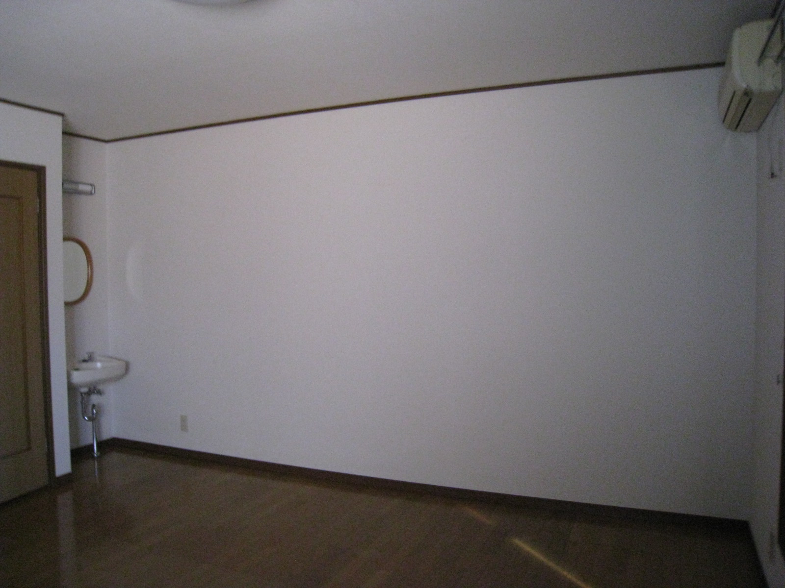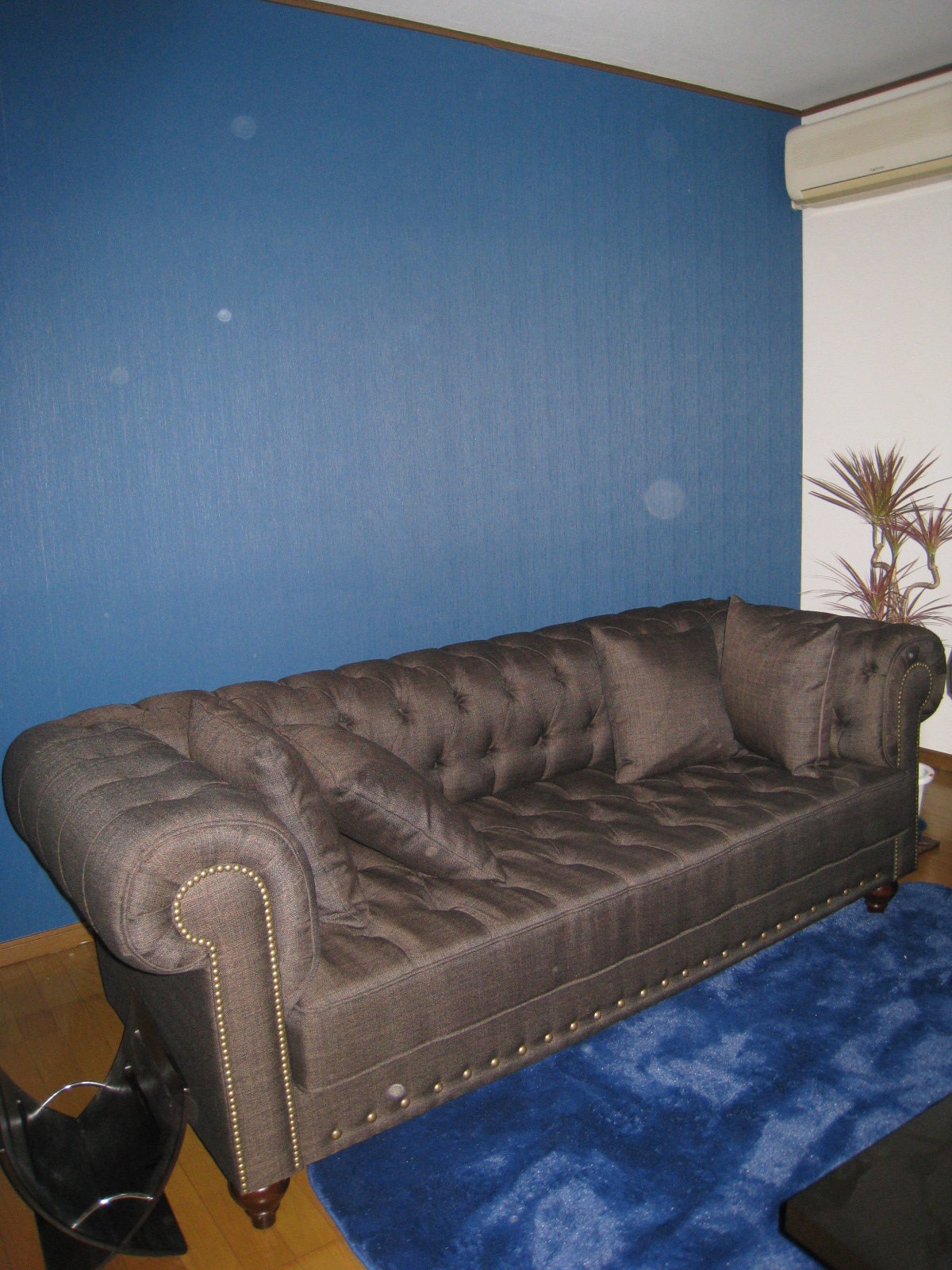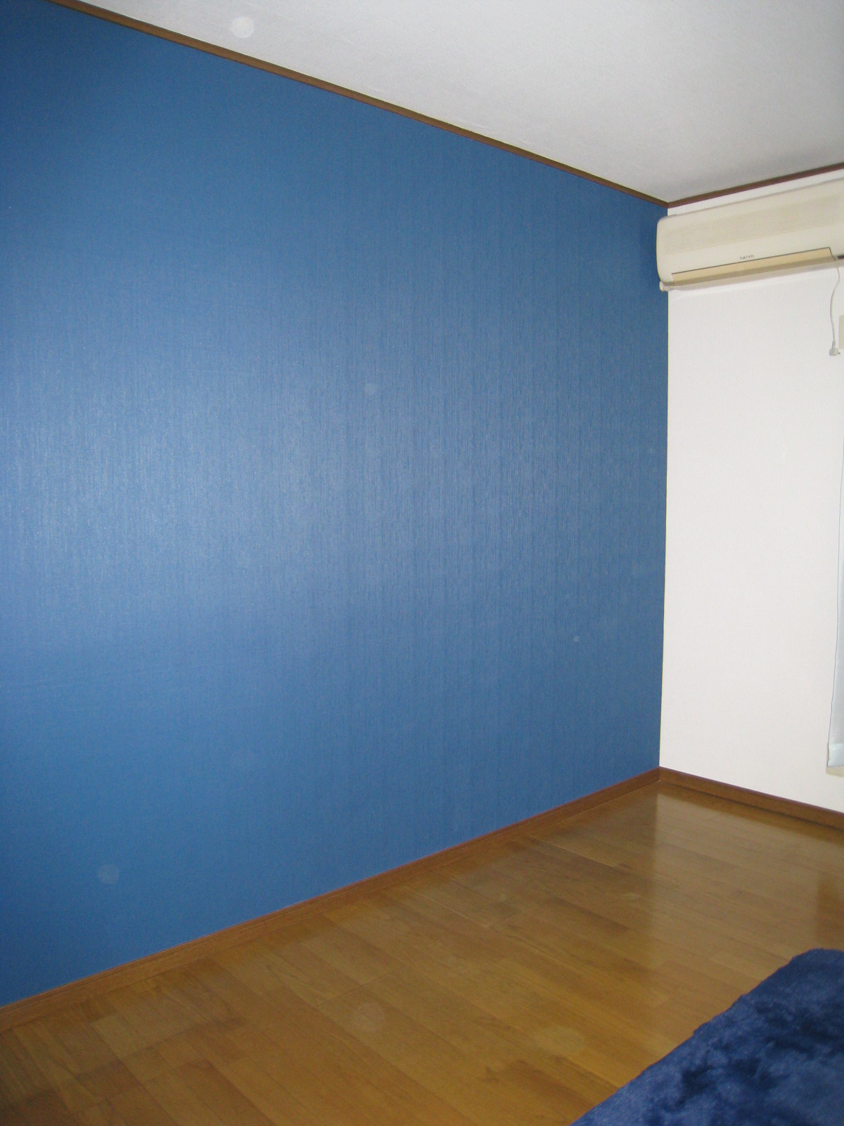 壁はブルーのデザインクロスにカウンターはウォールナット調で大人な雰囲気を演出