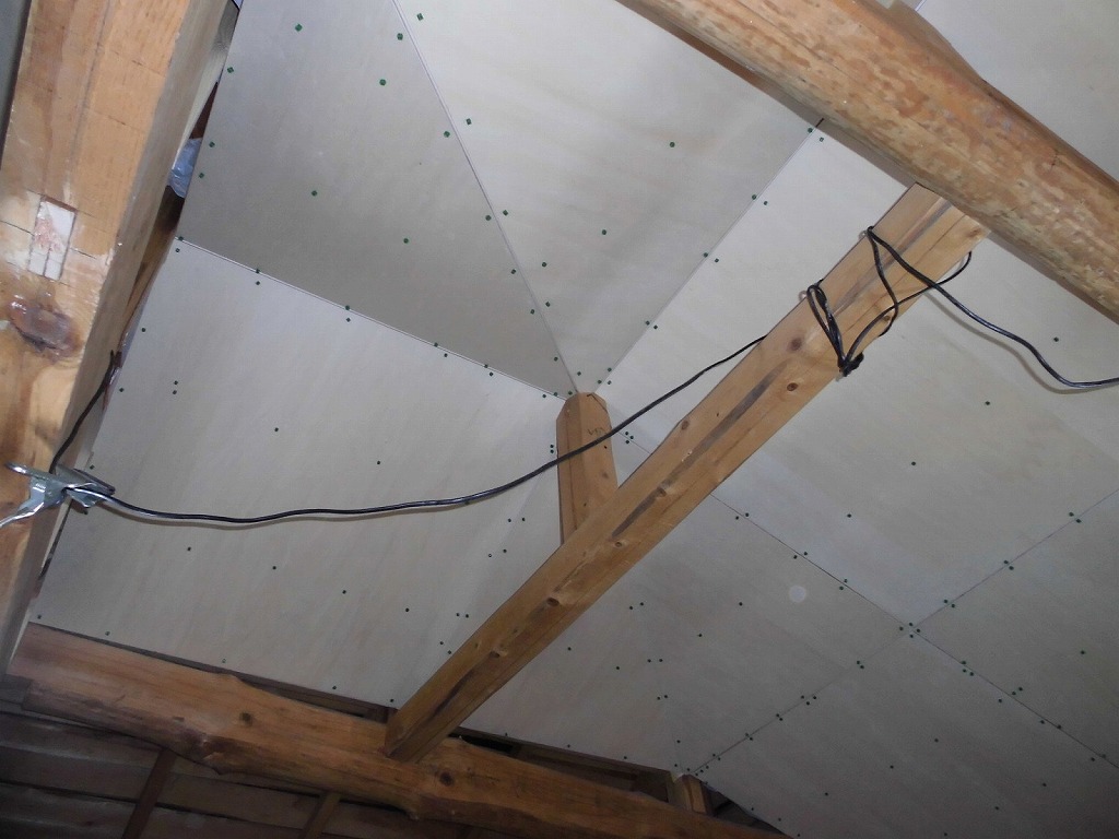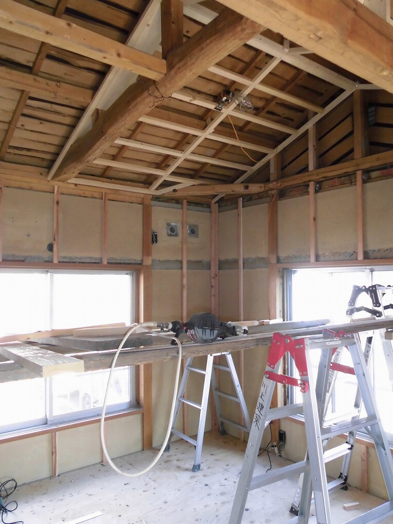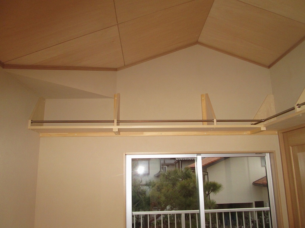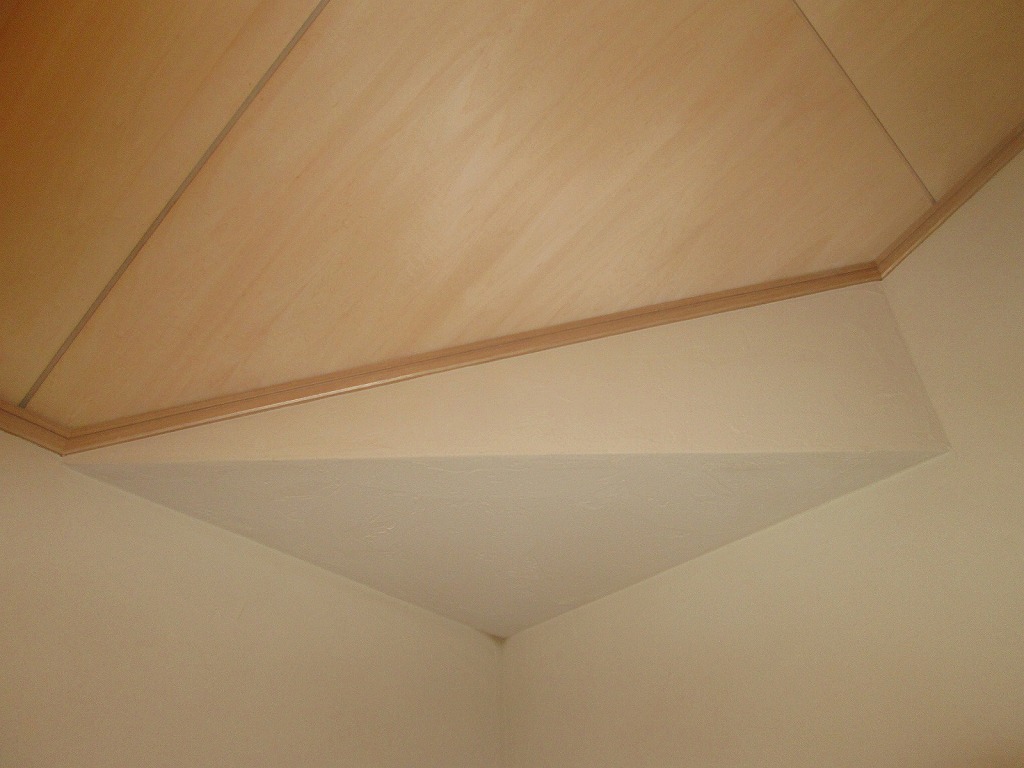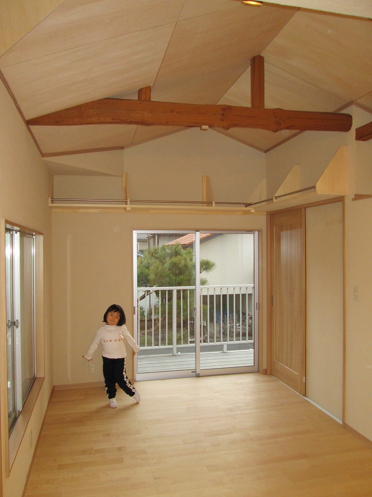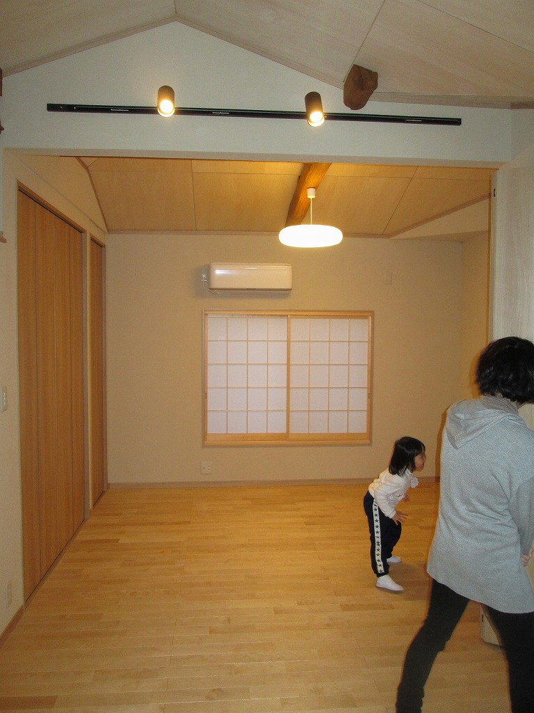 既存の障子を生かし、和室から和モダンな洋室へ。 立体感ある勾配天井と見応えのある梁がアクセントとなっています。 壁は珪藻土、床はカバの無垢フローリングで温かみが感じられます
