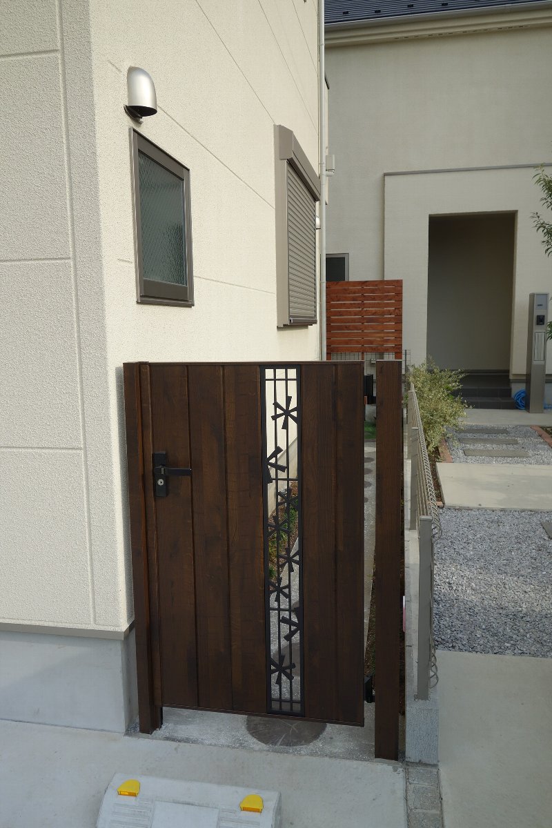 門扉は木目調でアイアンの花柄がポイントです。<LIXIL>ジオーナ門扉TC型