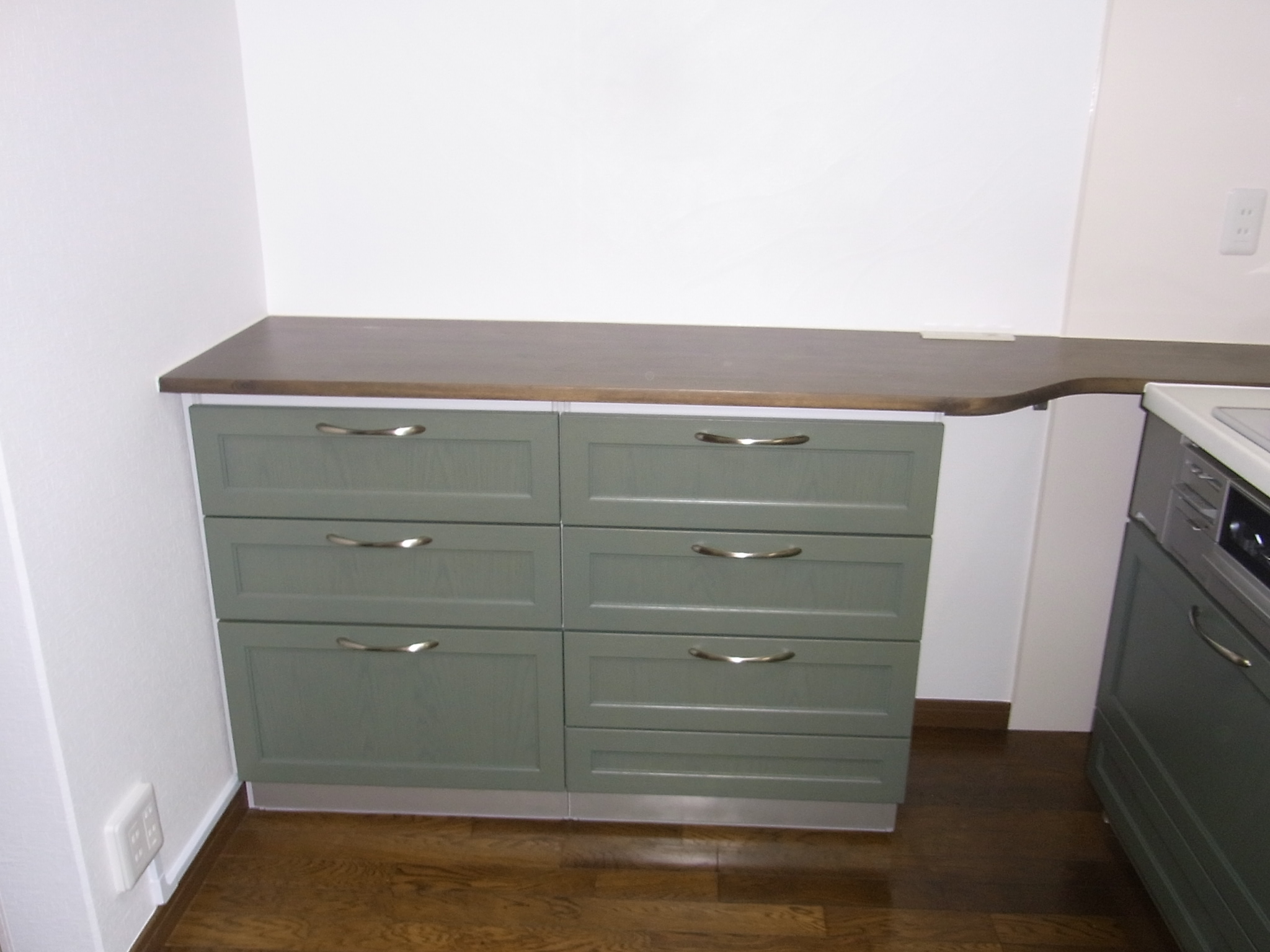収納キャビネットの上には、オリジナルの造作カウンターを設置(家電用コンセント付き)。これでお持ちの家電をスッキリきれいに並べて置くことが出来ます。