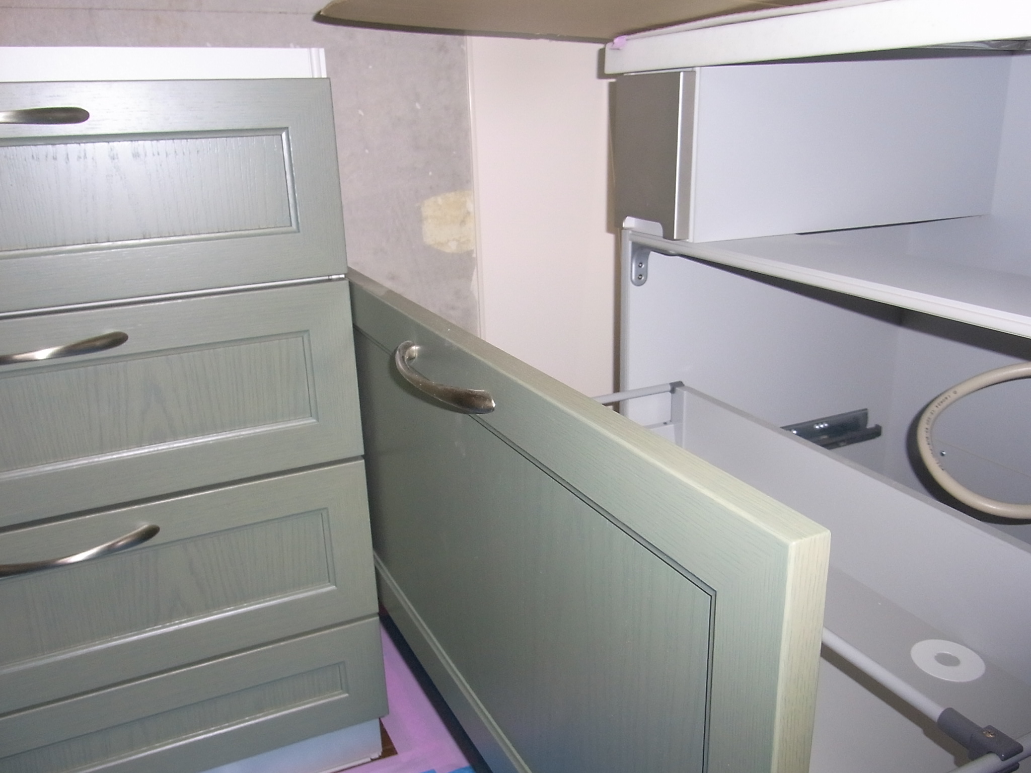 キッチンの引き出しが収納キャビネットにあたらないよう正確に設計。L型のレイアウトで注意するポイントです。