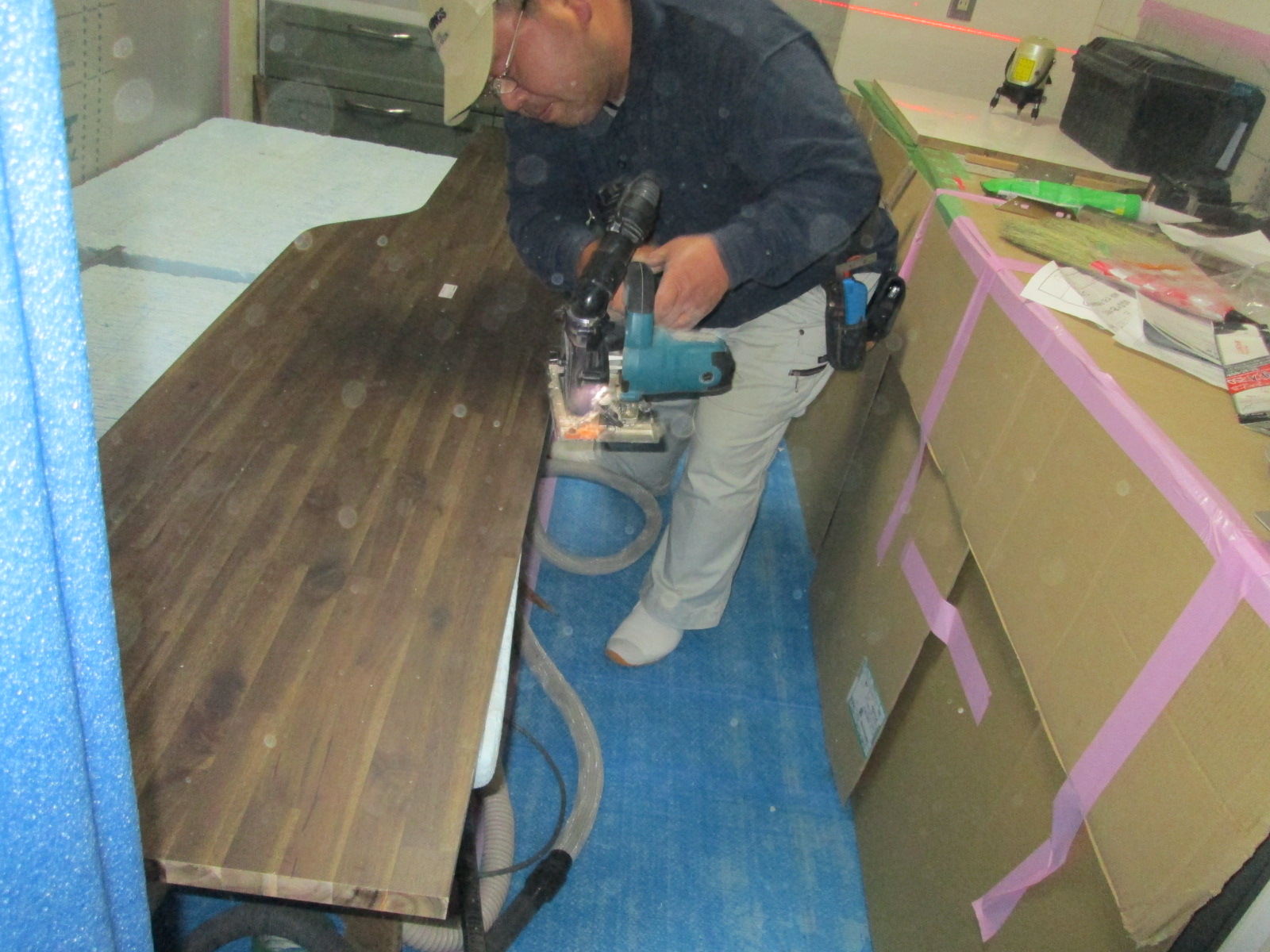 造作カウンターの最終調整は腕利きの大工さんが担当。緻密な計算と繊細なテクニックで見事に収めることが出来ました。