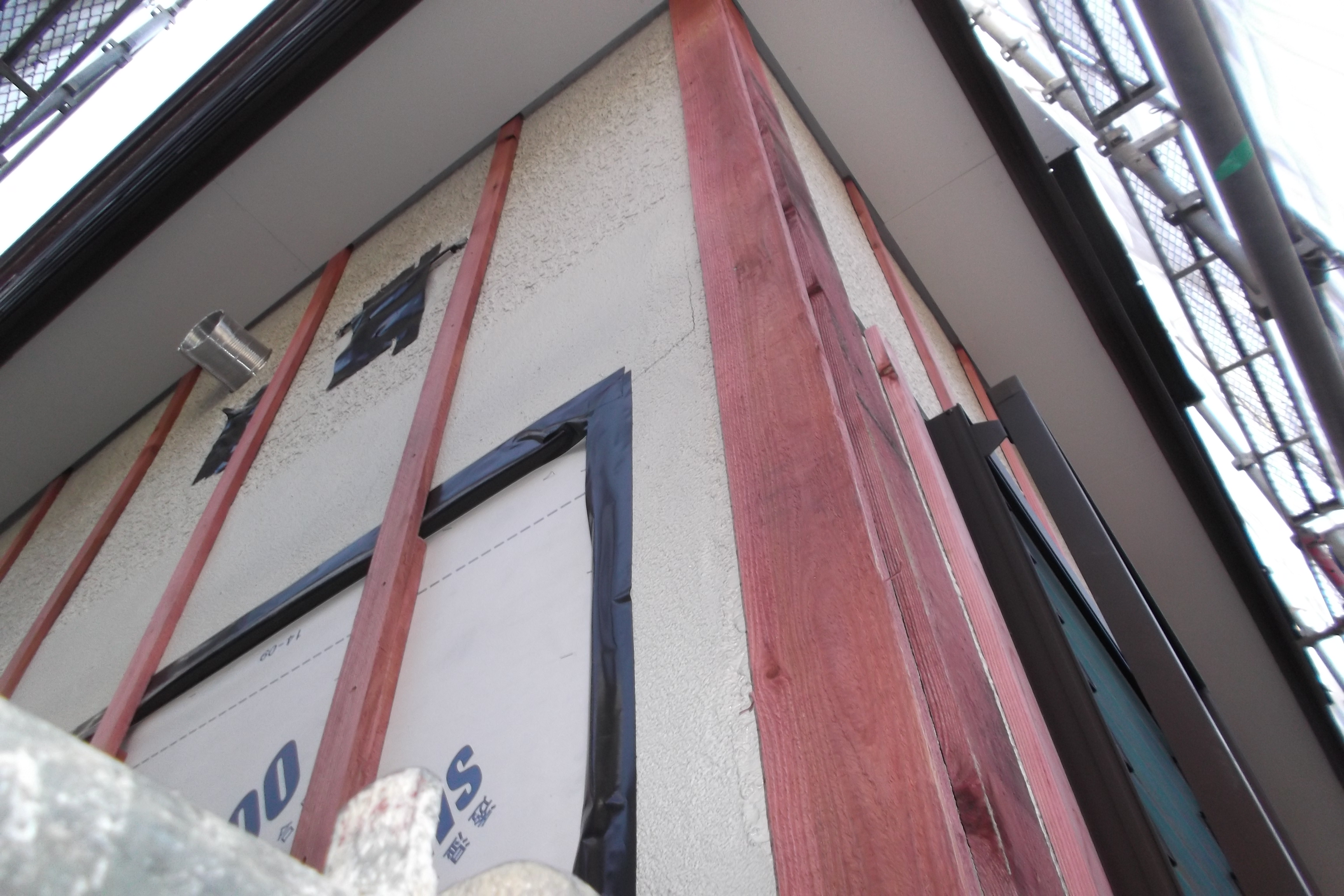 リフォーム中:モルタル外壁に、サイディングの下地となる縦胴縁を設置