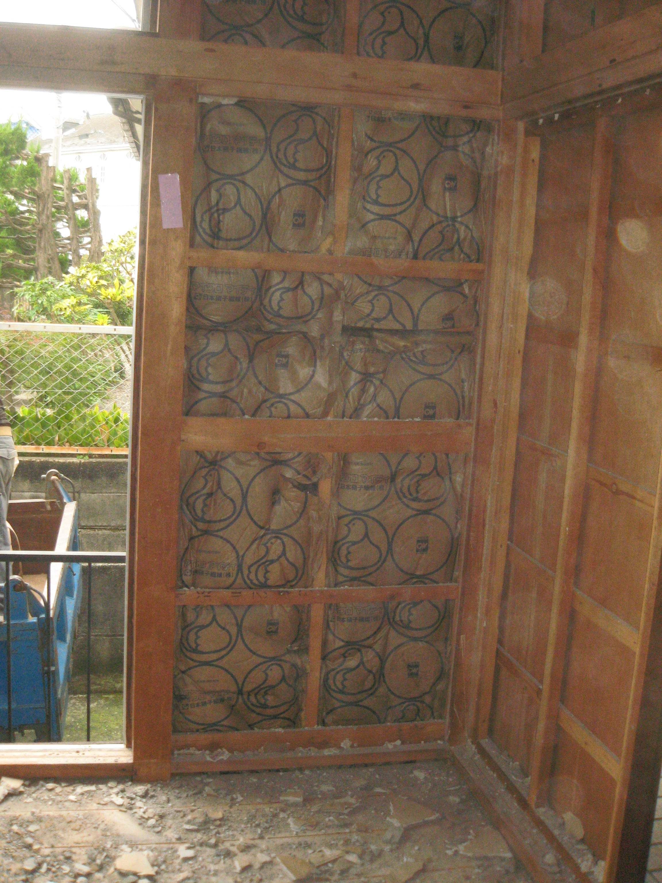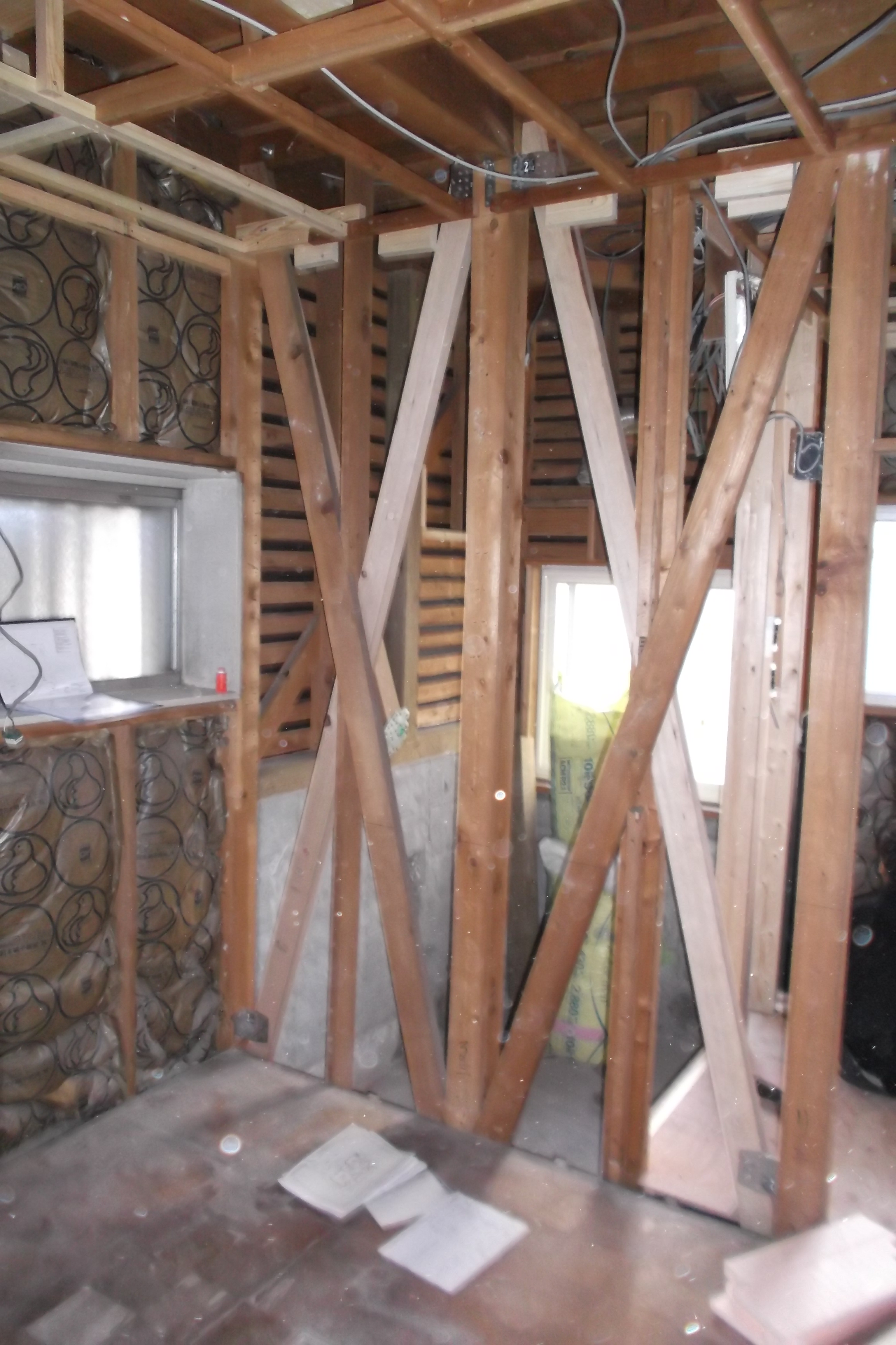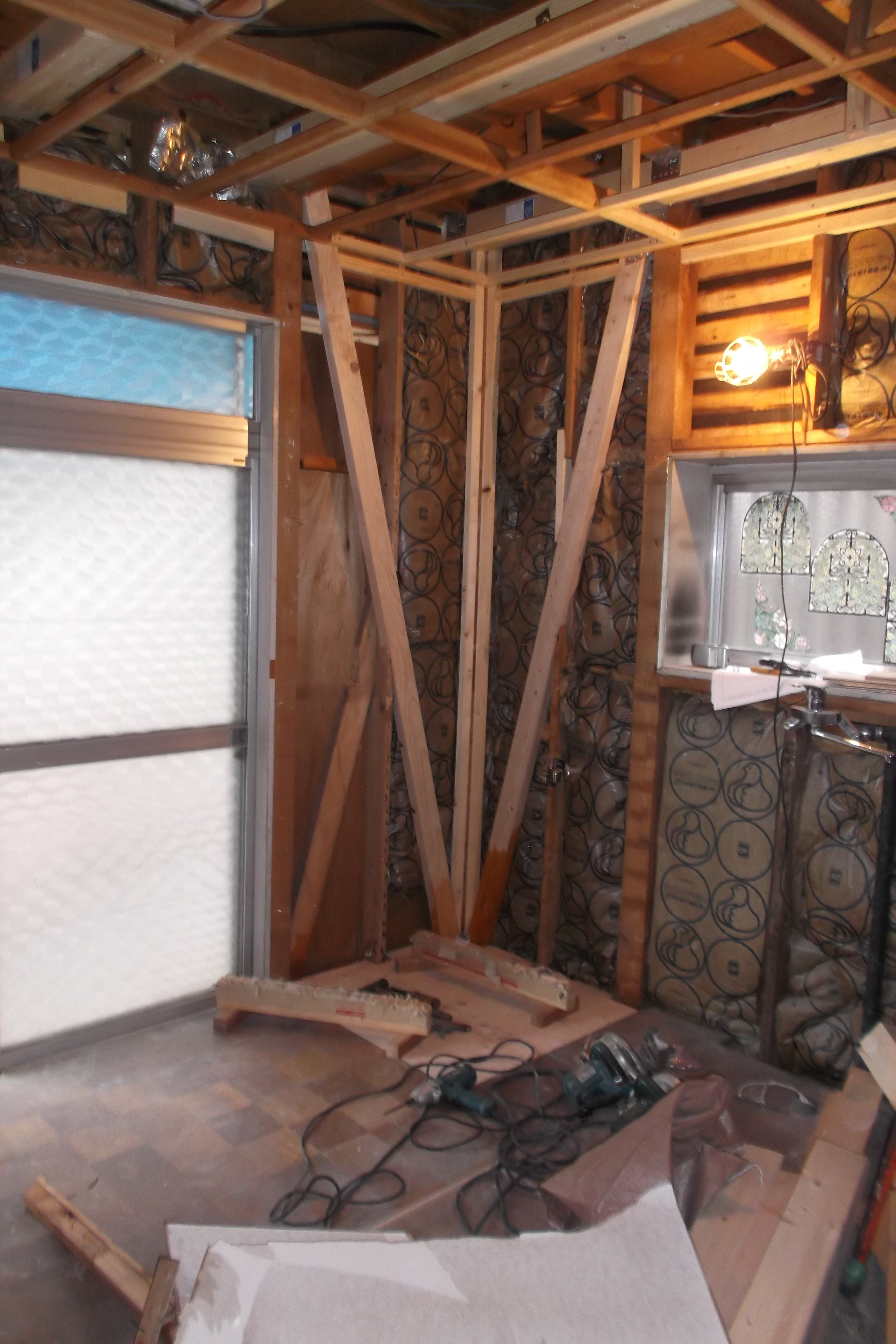 ビフォー:壁を剥がして、筋交いが入っていない所に筋交いを入れます