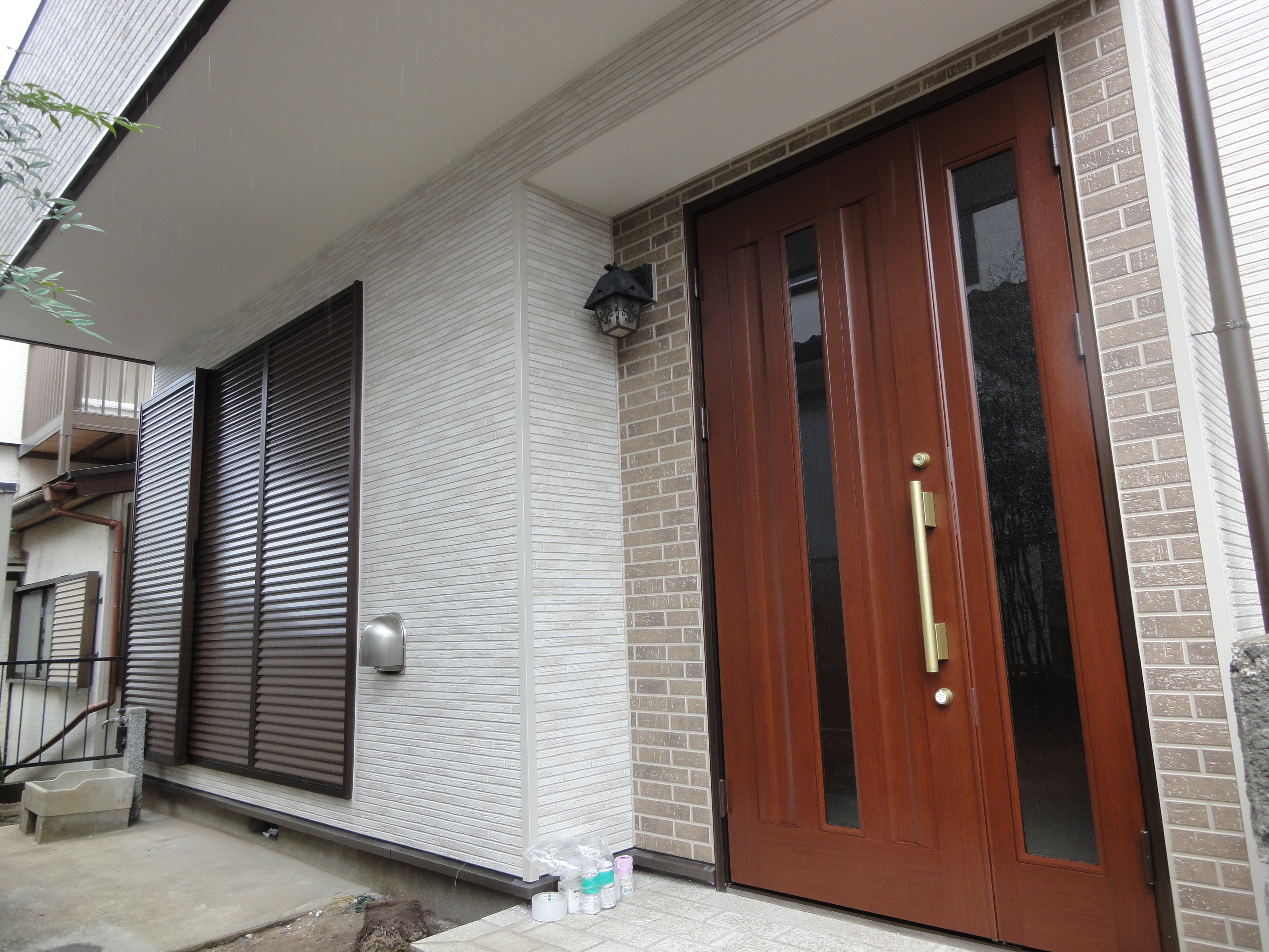 アフター:美しく貼り上げたサイディング。玄関ドアも交換して、周りは温かみのあるレンガ柄をセレクト!