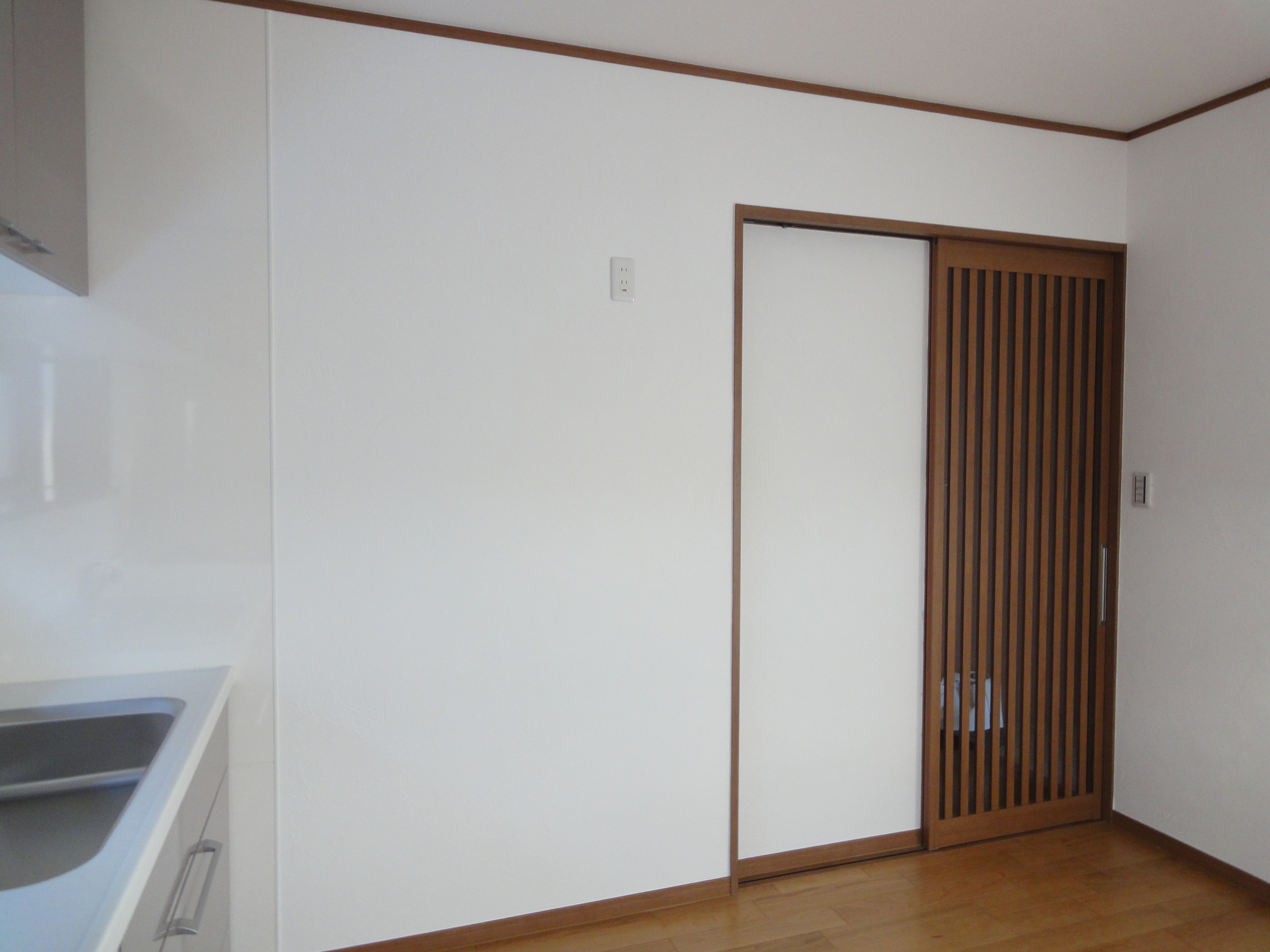 キッチン入口アフター:壁はスイス漆喰のおかげで明るくなりました。スリット入りのお洒落な引き戸は、奥様のお気に入り!