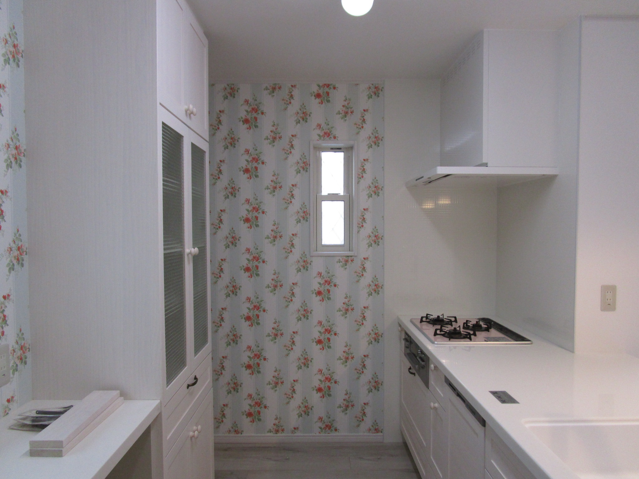 白を基調とした明るい対面キッチンへ。フラットのカウンターは作業スペースを広くとることができるので、奥様も大喜び!