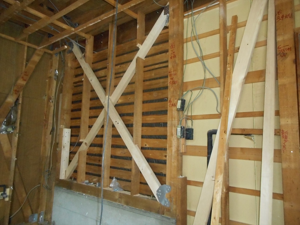 耐震補強工事。適所に筋交いを設置。工事に伴い天井まで剥がしています。