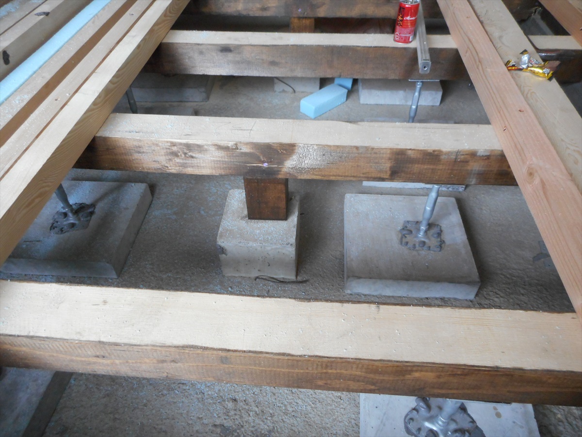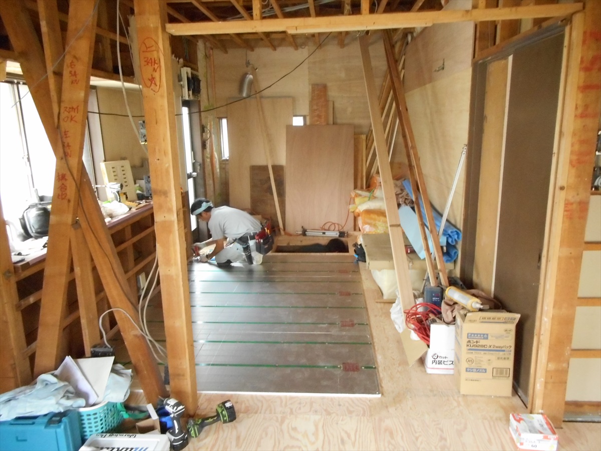 根太と根太の間に断熱材を詰めていき床下地を仕上げていきます。