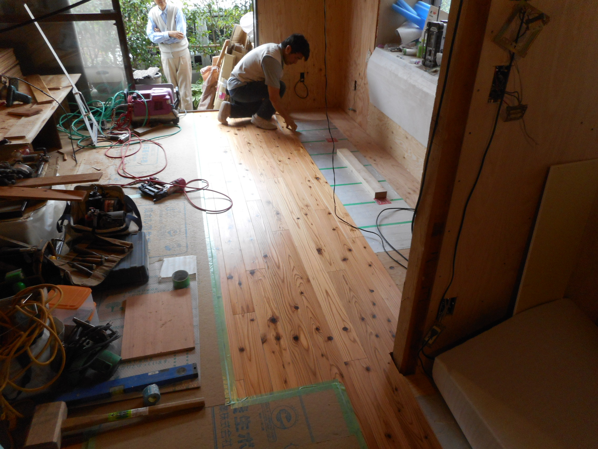 無垢フローリング施工中。1枚1枚丁寧に張り合わせていきます。