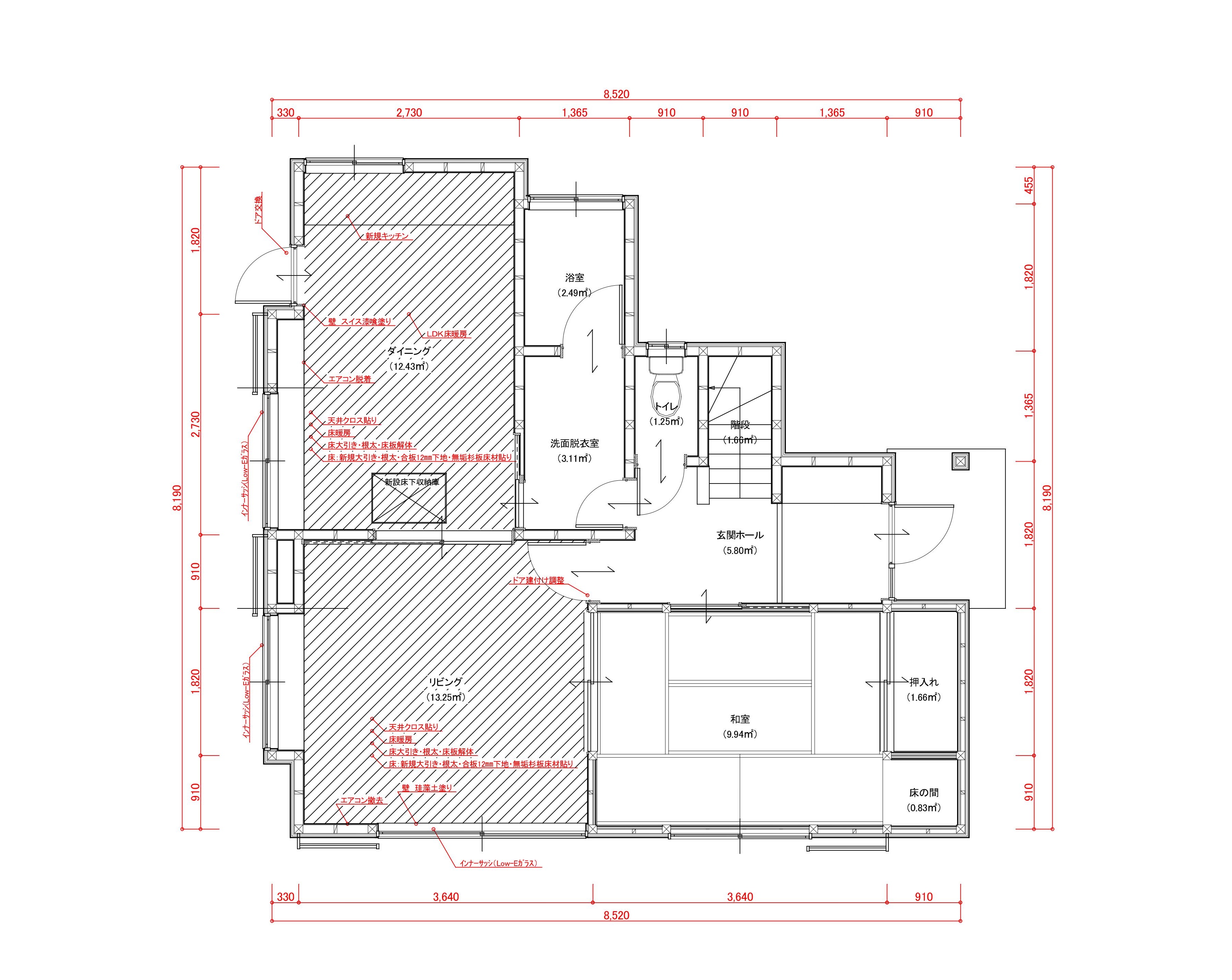 今回のリフォーム箇所はダイニングリビング(斜線部)