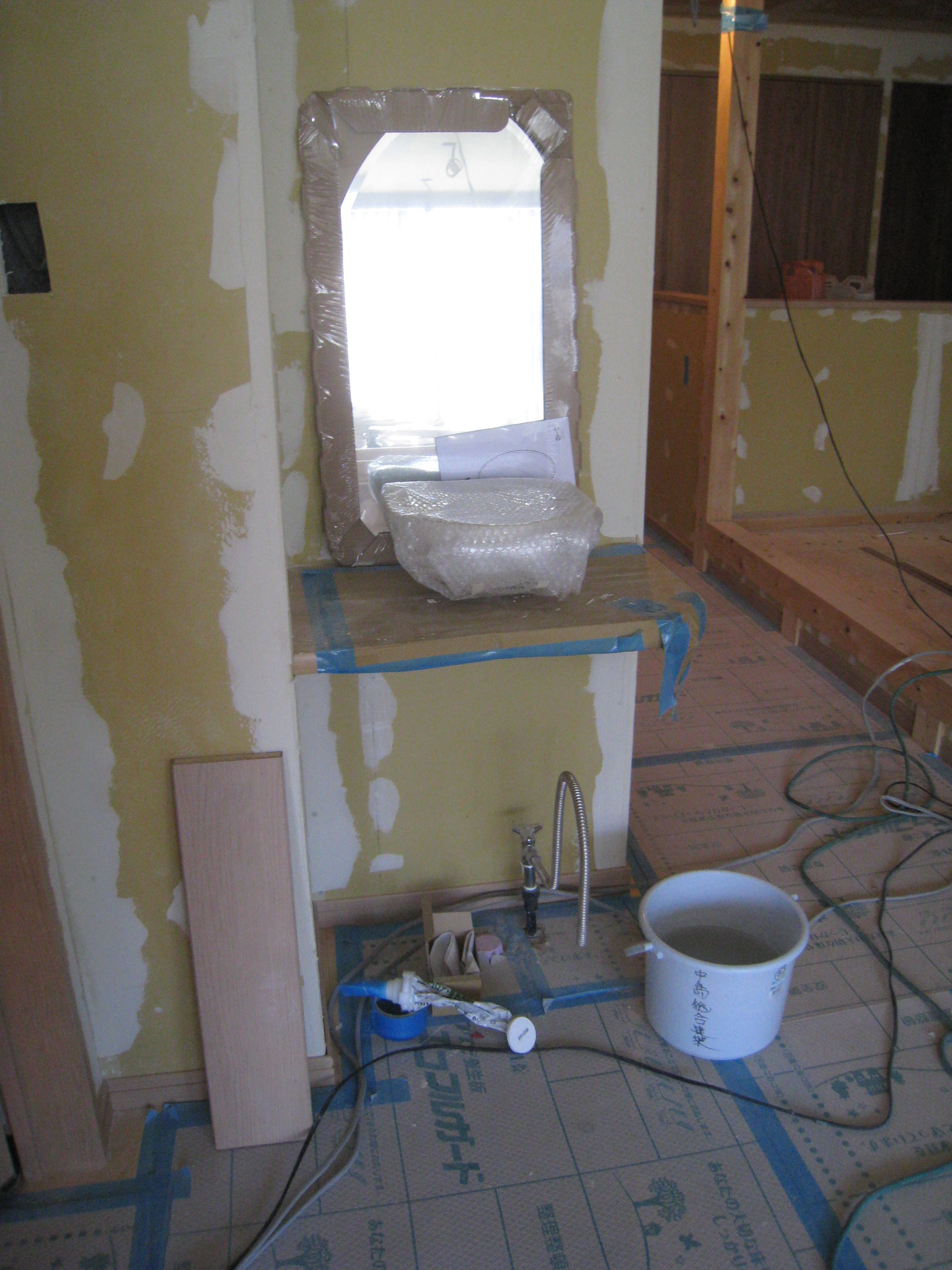 カウンターは造作して、おしゃれなミラー、水栓、ボウルをつけます