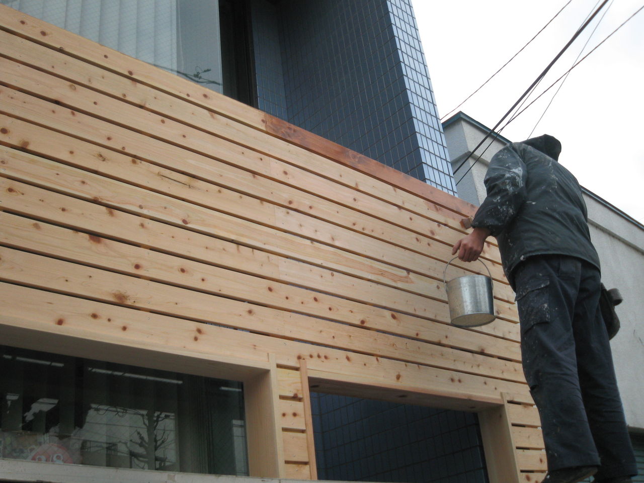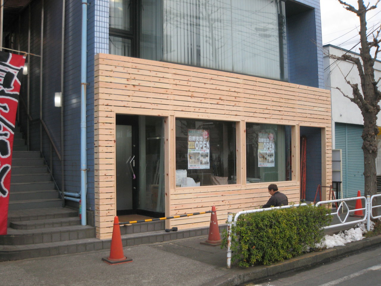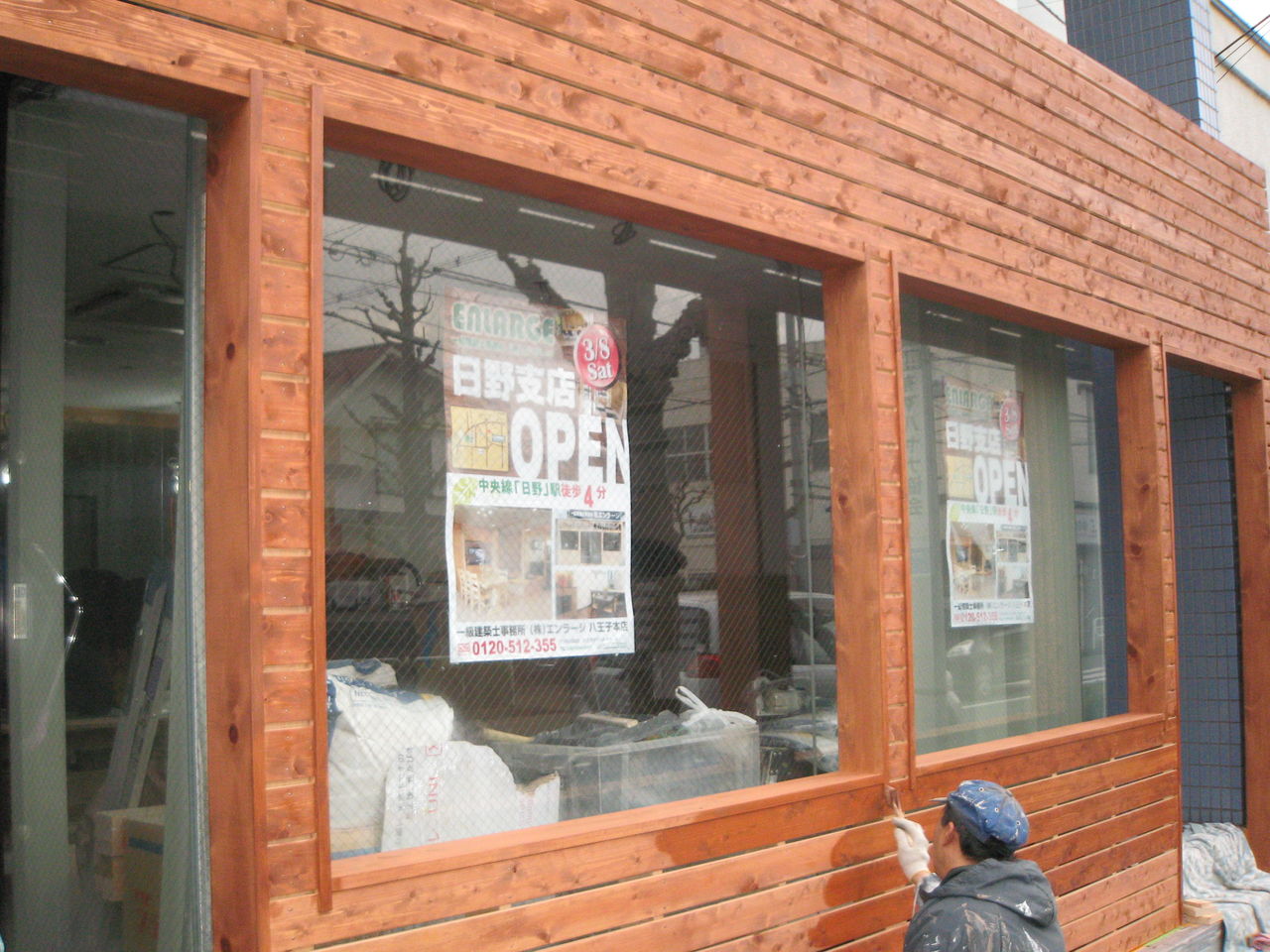 エンラージの象徴ともなるあのウッド調の外観が出来上がりました