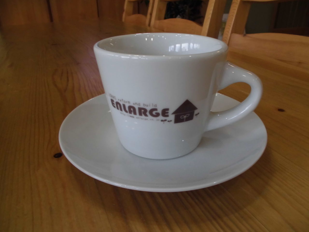エンラージのロゴが入ったコーヒーカップとソーサーのセット