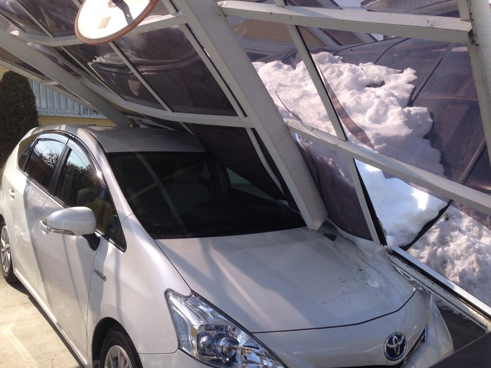 積雪の重さに耐えきれず、真ん中からグシャリと折れてしまい、大切なお車に傷がついてしまいました。