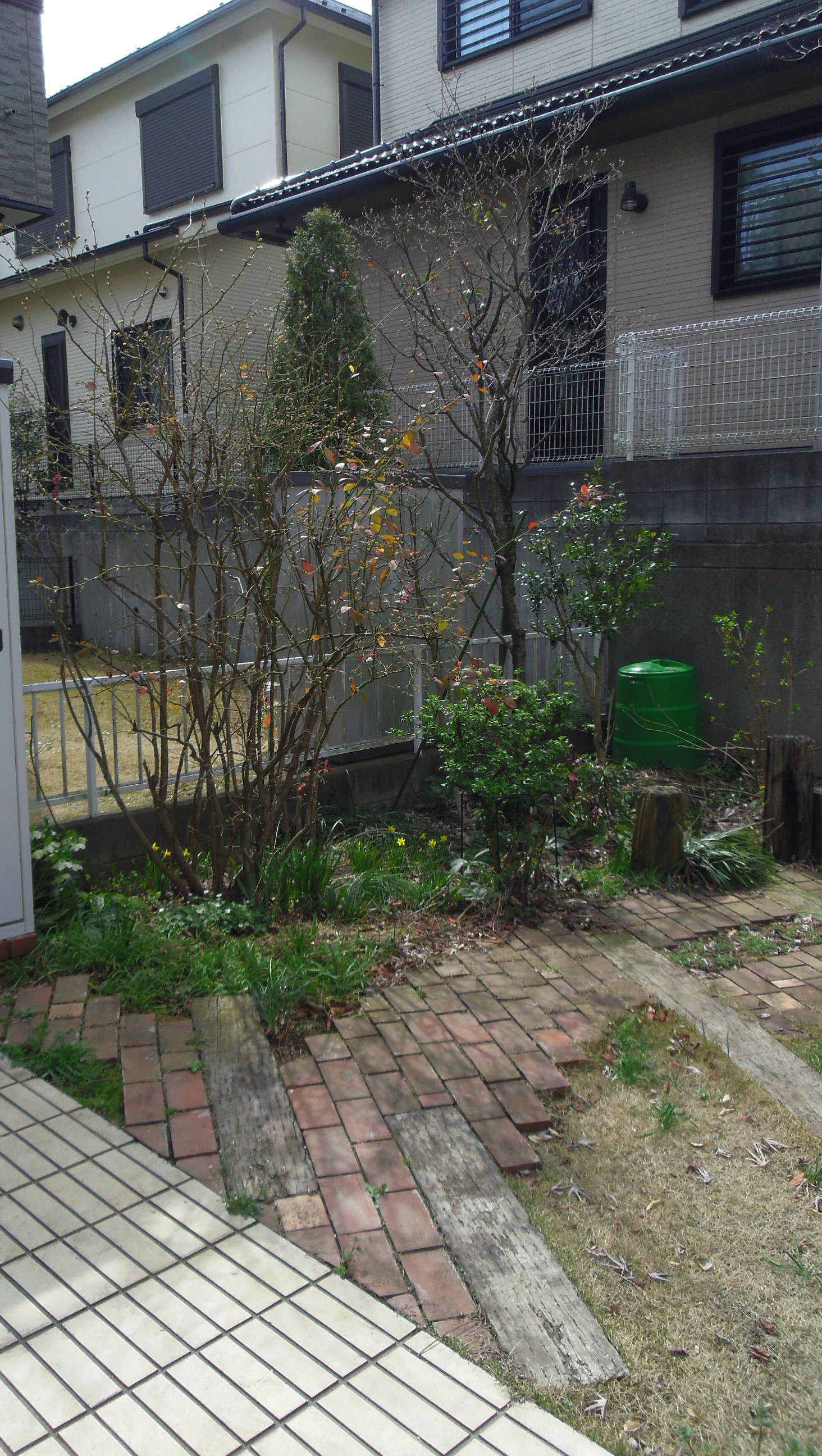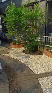 レンガと枕木のアプローチはそのまま残し、雰囲気を合わせてデザインしました。