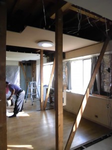 キッチン、ダイニング、リビングの間仕切りを撤去しているところです。