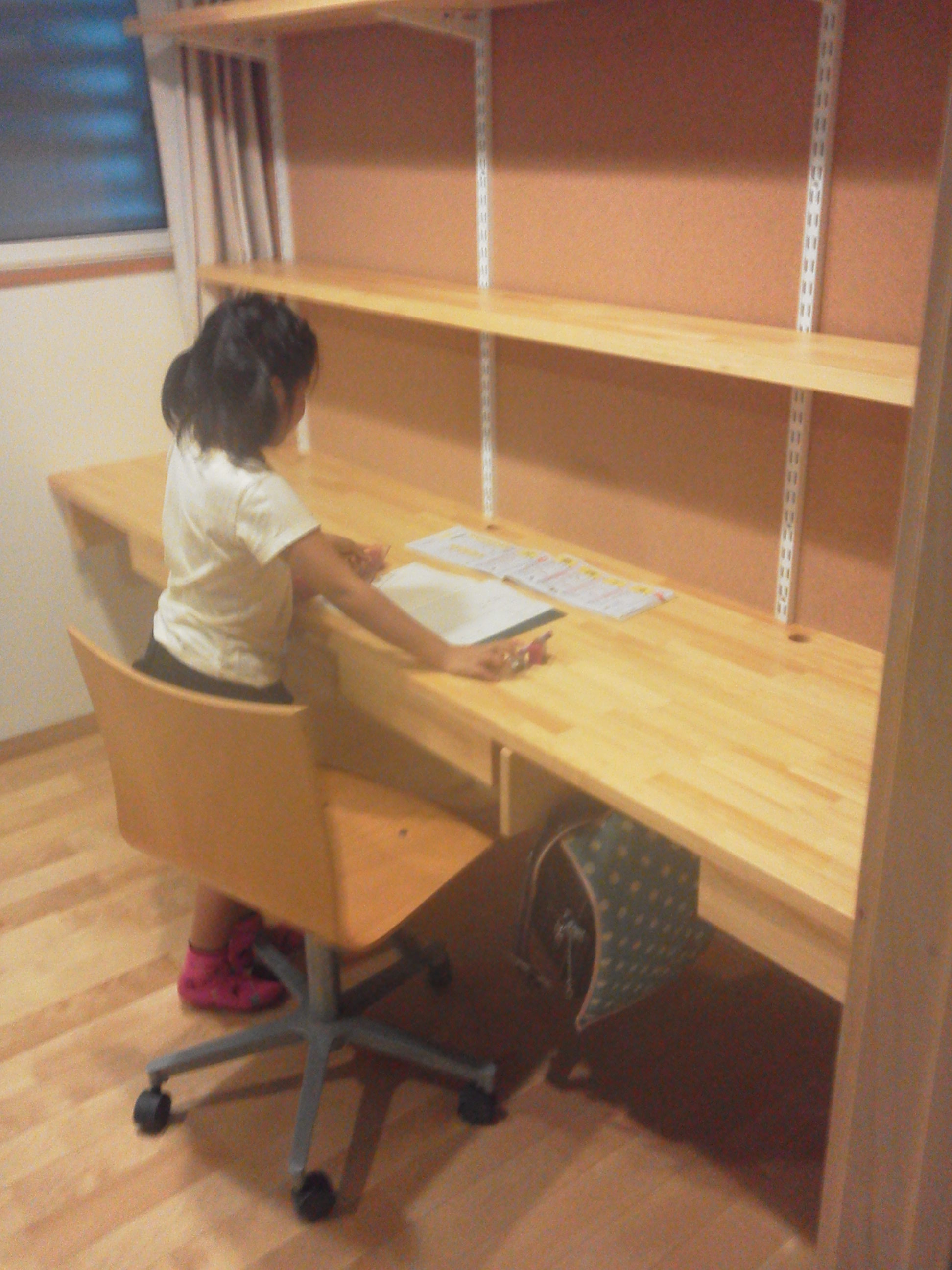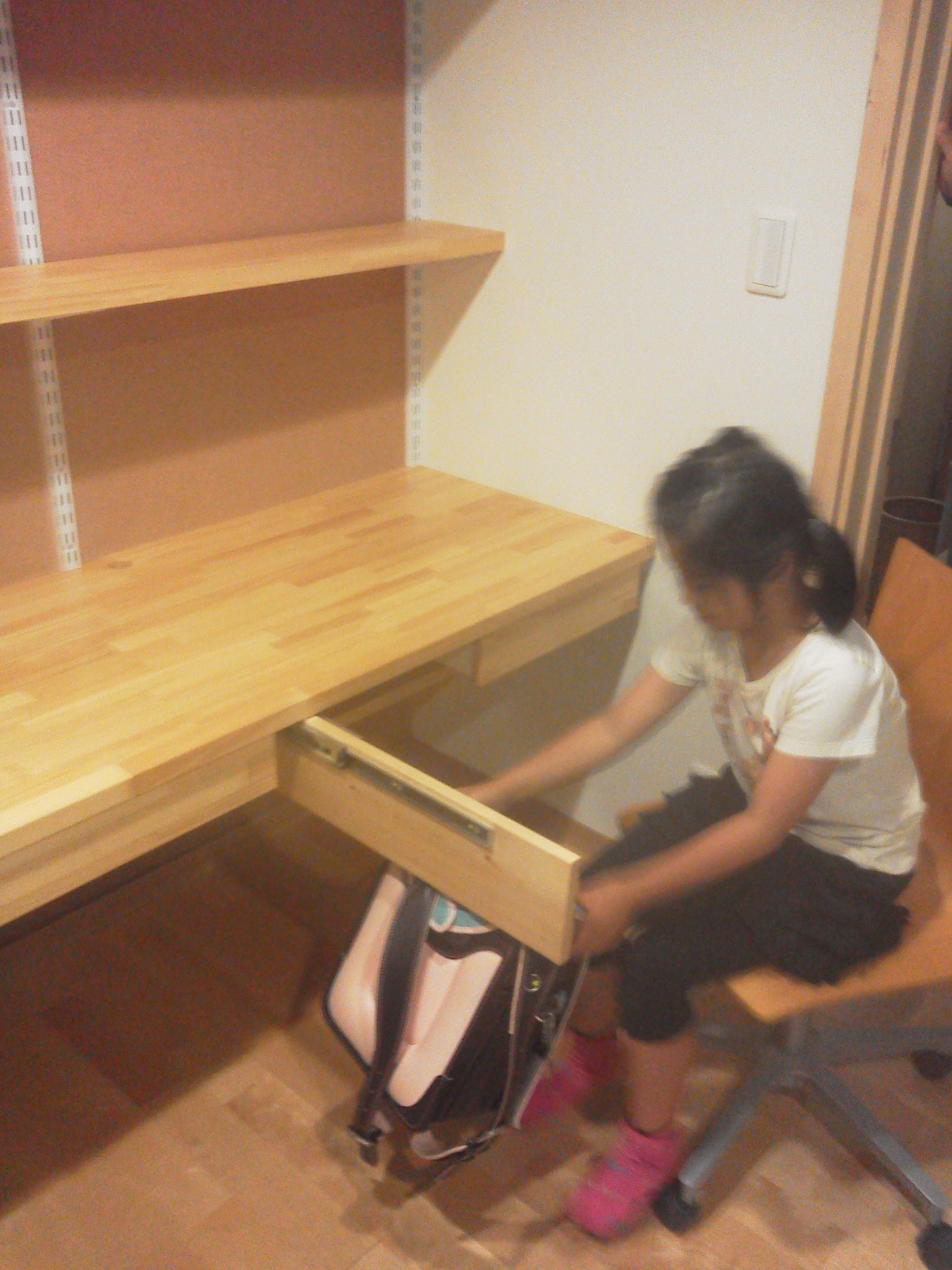 M様の娘様が走って部屋に駆けつけてきて作った机にちょこんと座りました。