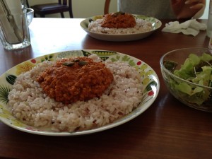 ランチメニューはキーマカレーと雑穀米、サラダにニンジンジュースがつきます。