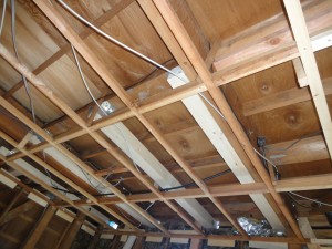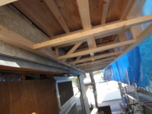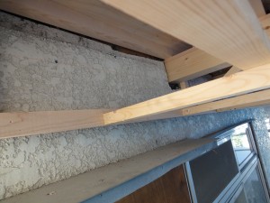 先程の木材(色が白っぽいの)が既存の梁にしっかりと固定されています!バルコニーの出幅の2倍くらいの長さです。