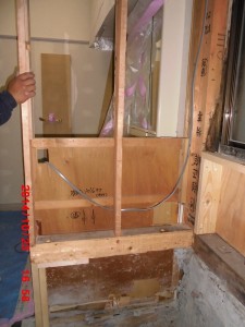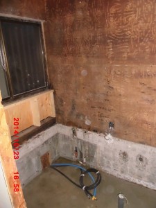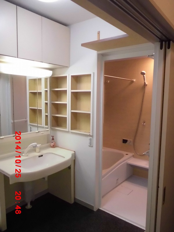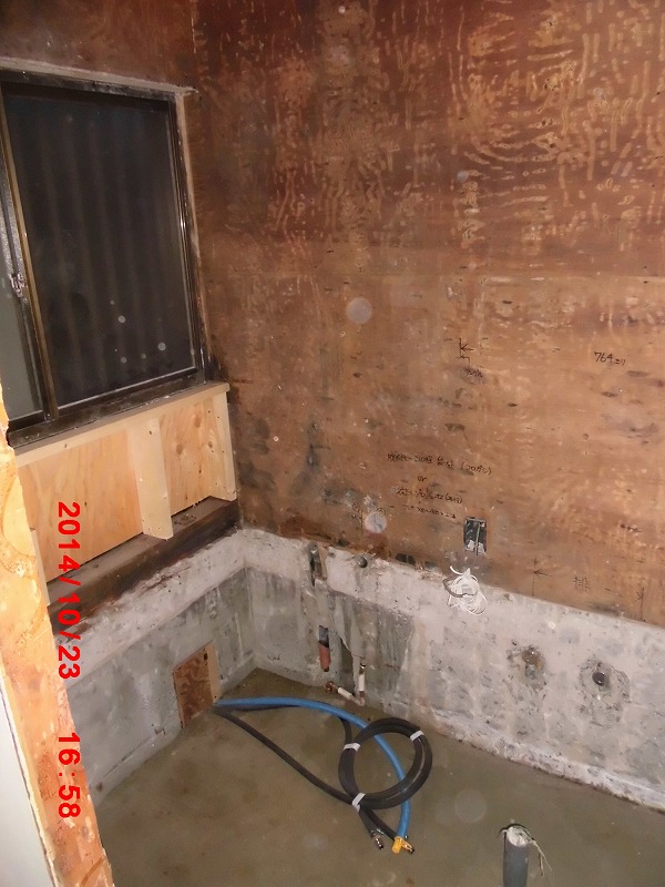 脱衣室側には、ニッチ風の棚が埋め込みで作られていましたが、それらもすべて一時撤去し、大工さんの方ですべて
