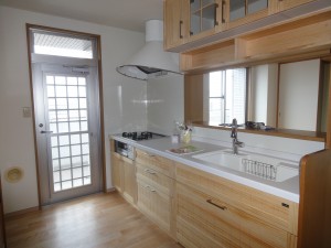 パイン材のキッチンとメープルの床の相性もばっちりでした