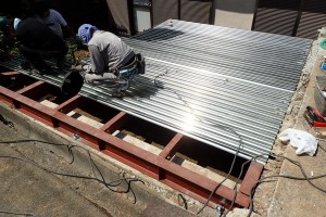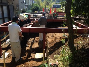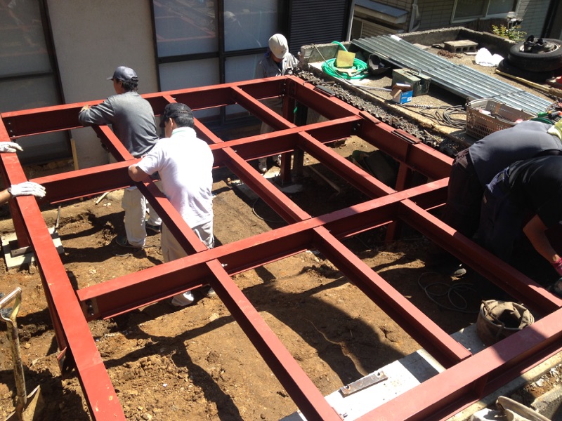 そして、鉄骨を組み立てます。職人さん汗だくです